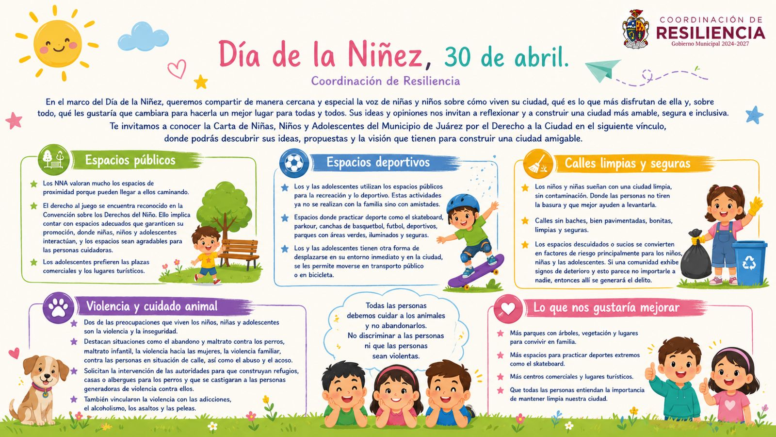 En el marco del Día de la Niñez, la Coordinación de Resiliencia comparte la voz de niñas, niños y adolescentes sobre cómo viven su ciudad, con el objetivo de visibilizar sus ideas, preocupaciones y propuestas para mejorar el entorno.