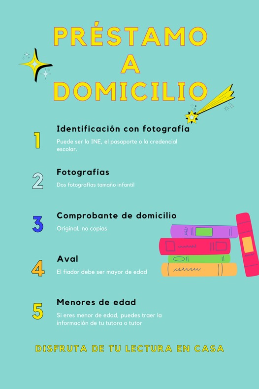 Personal de la Dirección de Educación Municipal informó que para poder obtener un libro en préstamo, es necesario presentar comprobante de domicilio, dos fotografías tamaño infantil, identificación con foto, y si la persona es menor de edad, puede acudir con la información de sus padres o tutores.