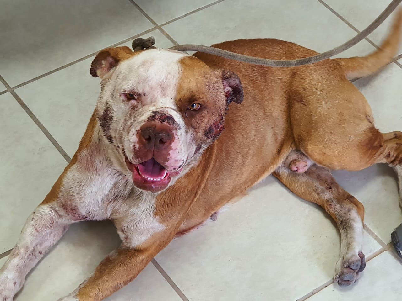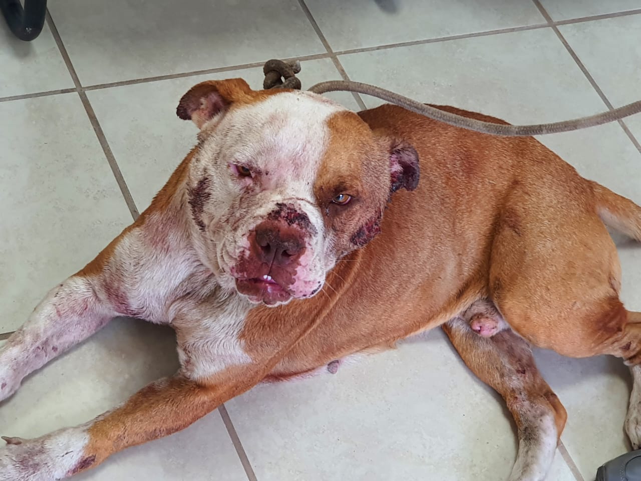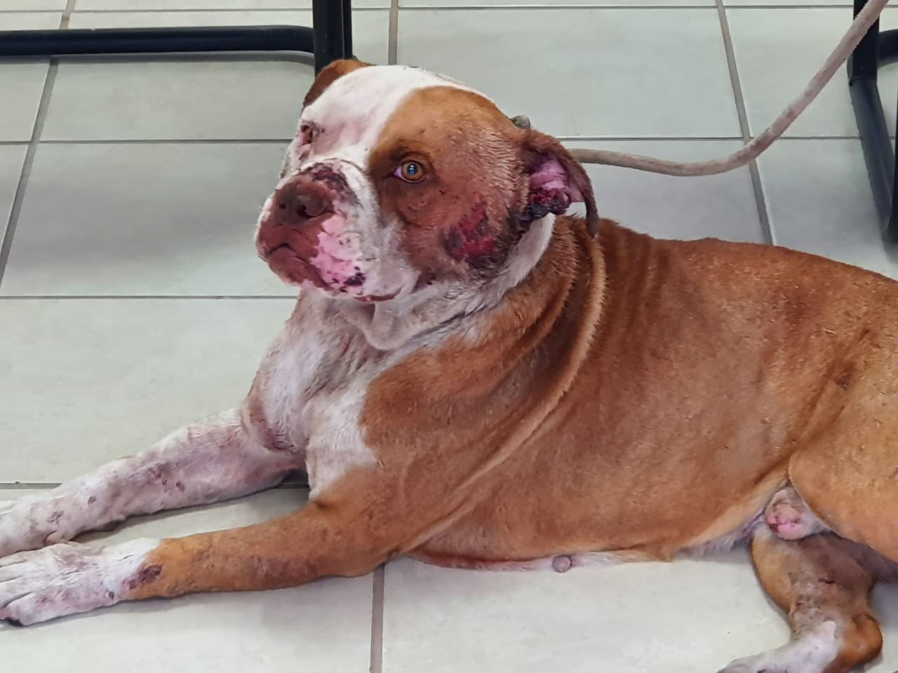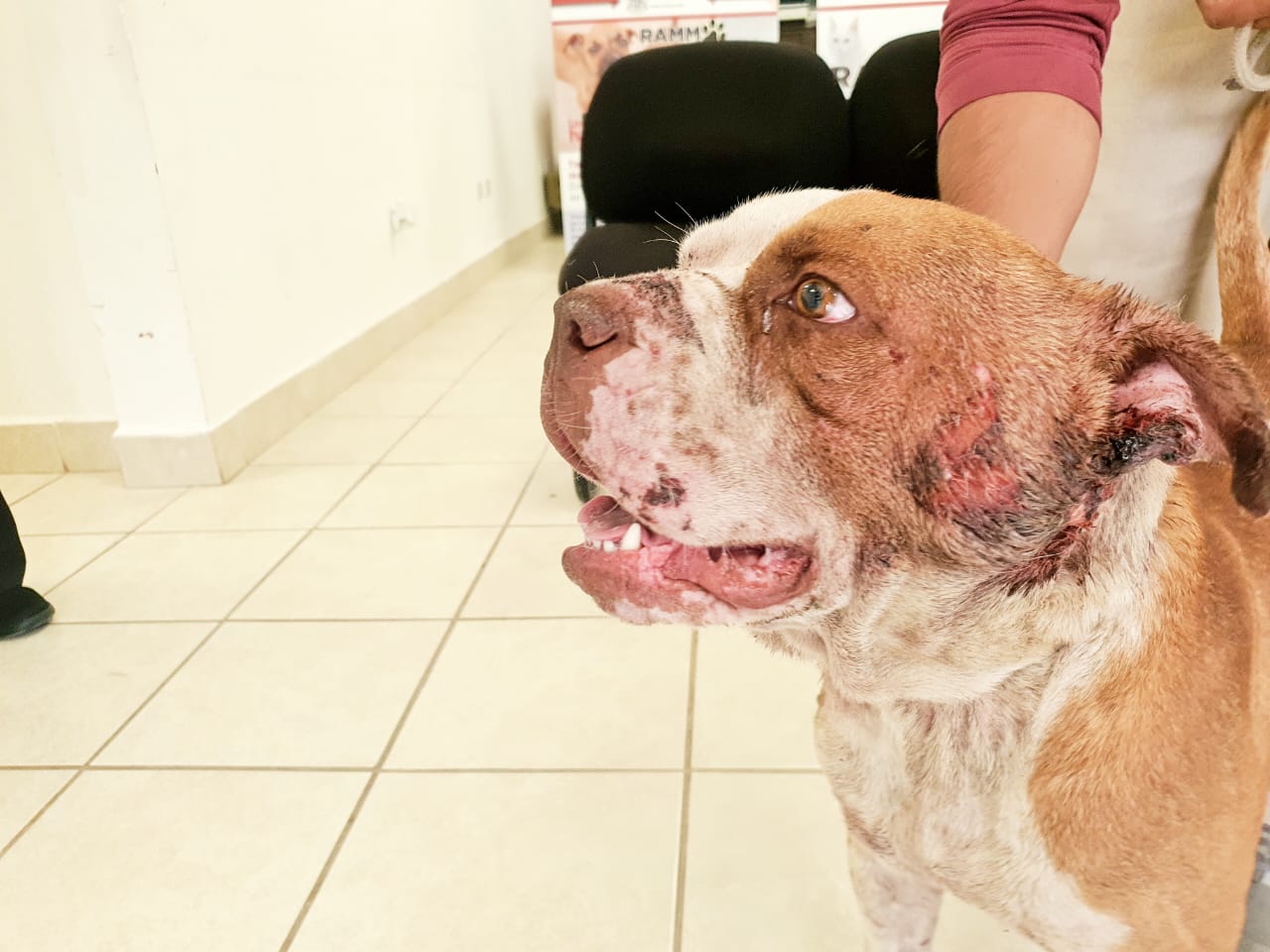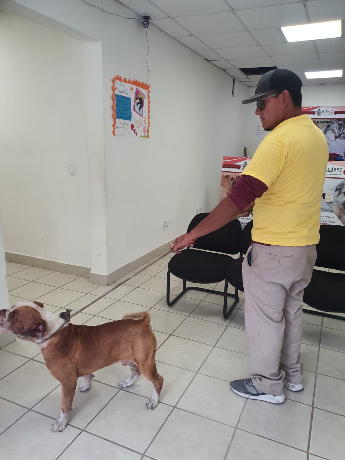 Personal operativo de la Dirección de Limpia que se encontraba en labores de limpieza en el cruce del Eje Vial Juan Gabriel y calle El Vergel, rescató a un perro que fue abandonado en un terreno baldío y presenta lesiones.