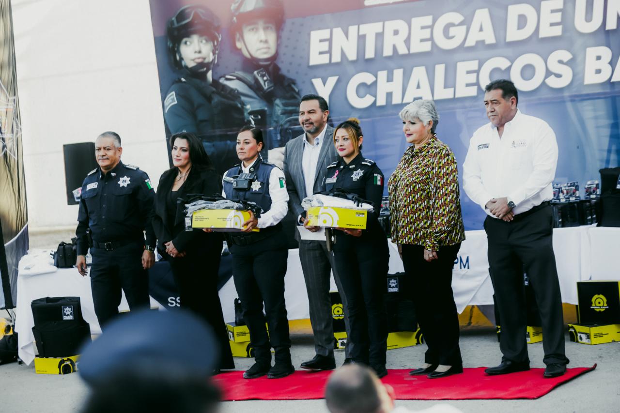 La mañana de este viernes Ana carmen Estrada, Síndica Municipal, constató la entrega de uniformes y chalecos balísticos a los elementos de la Secretaría de Seguridad Pública Municipal, evento encabezado por el Presidente Municipal Cruz Pérez Cuéllar, acompañado por el secretario de la SSPM, César Omar Muñoz Morales.