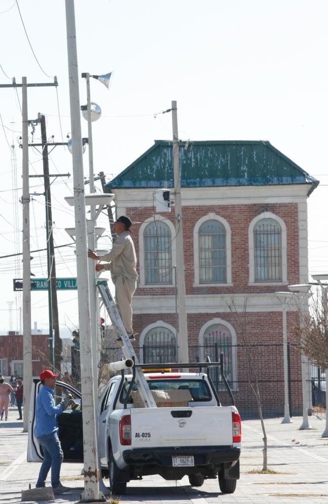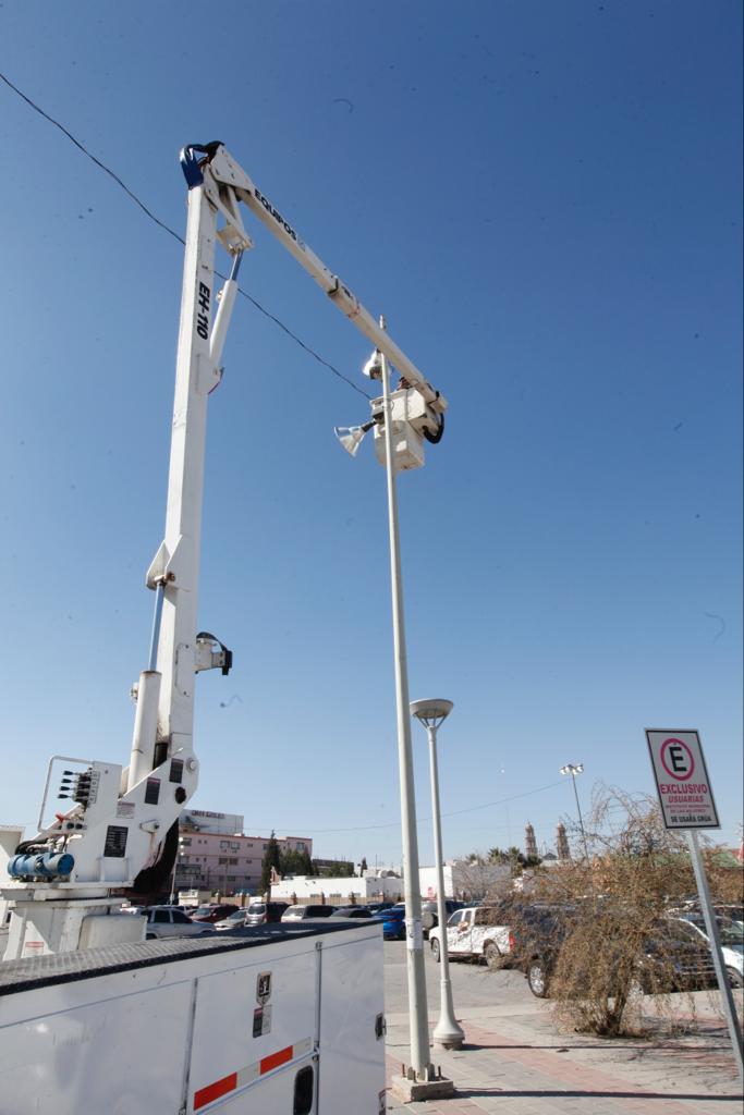 Como parte de la estrategia para mejorar el primer cuadro de la ciudad, personal de la Dirección General de Servicios Públicos trabaja en la rehabilitación de luminarias de la Plaza Guadalupe, situada en la Zona Centro, además de limpieza en ese espacio y calles aledañas.