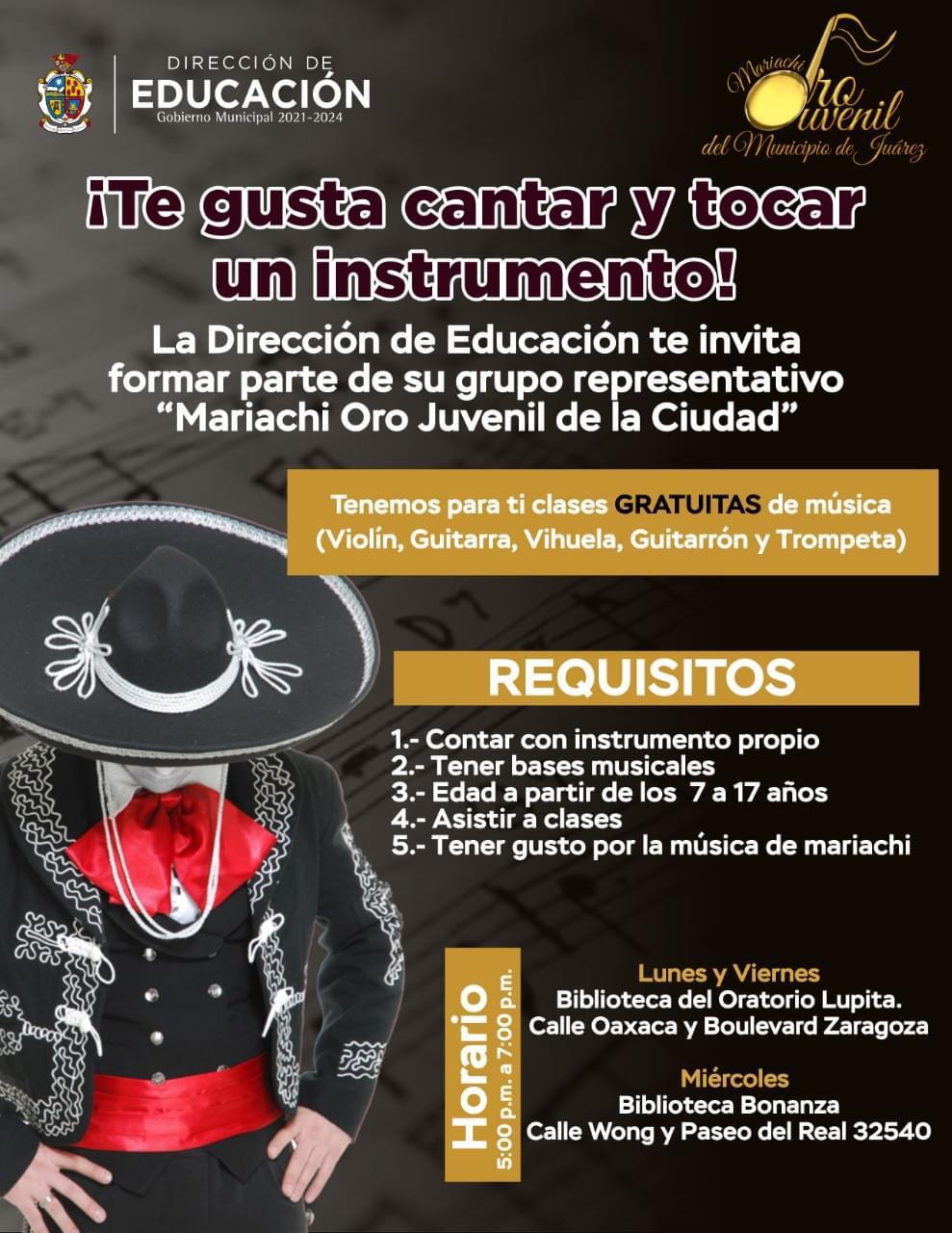 La Dirección de Educación invita a niños y adolescentes que tengan gusto por la música a que se integren al Mariachi Oro Juvenil de la Ciudad.