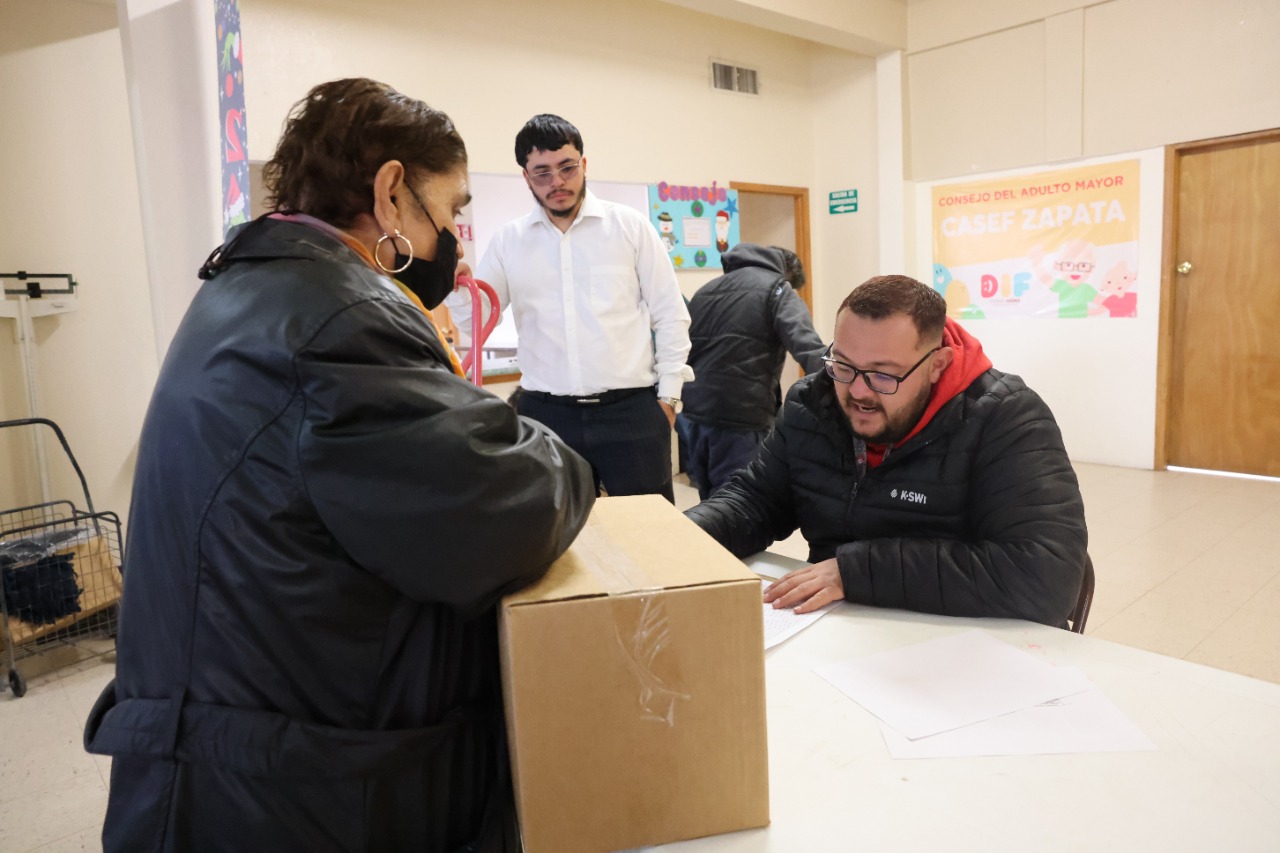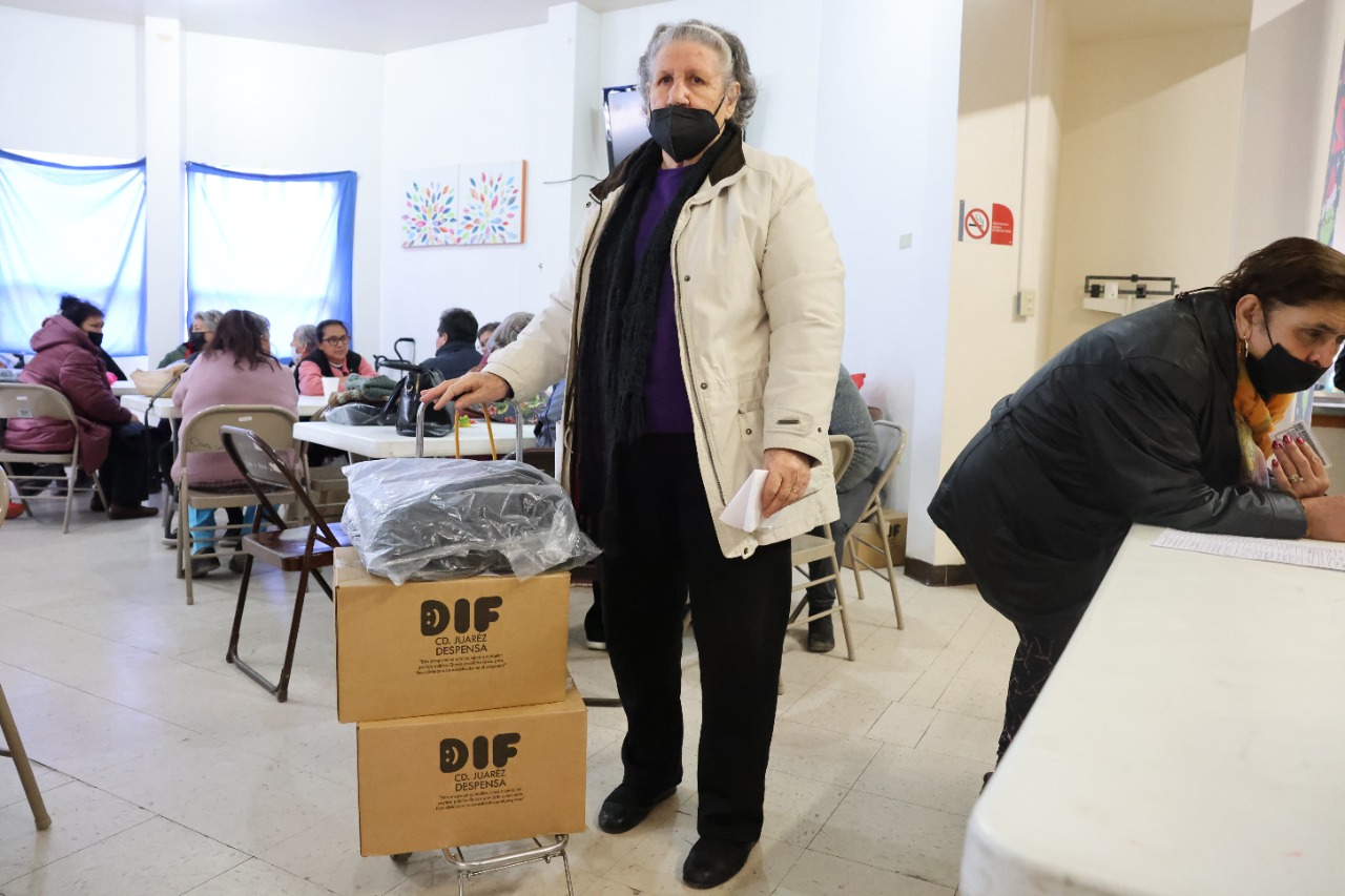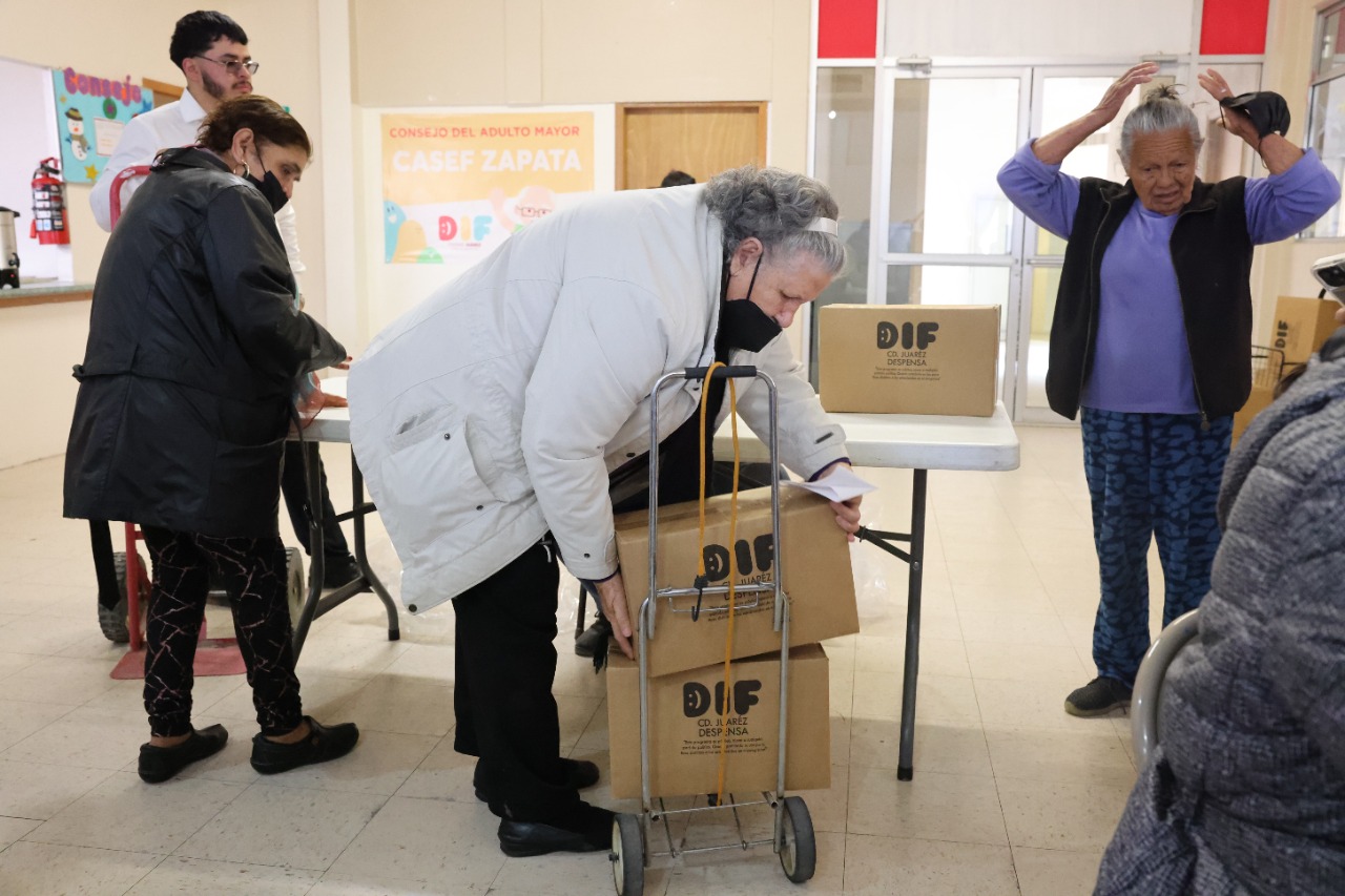 Por tercera semana consecutiva, brigadas del Sistema para el Desarrollo Integral de la Familia de Juárez, (DIF) recorren de lado a lado la ciudad en la entrega de apoyos alimentarios y chalecos invernales para las personas adultas mayores que conforman los Consejos del Adulto Mayor.
