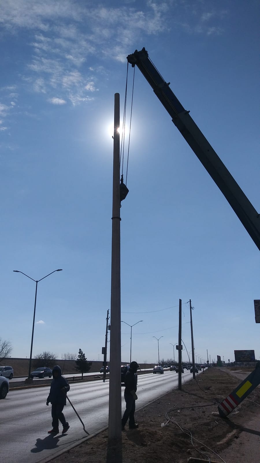 Personal de la Dirección de Alumbrado Público trabajó en el sistema de iluminación del bulevar Juan Pablo II, a la altura de la calle Calzada del Río.