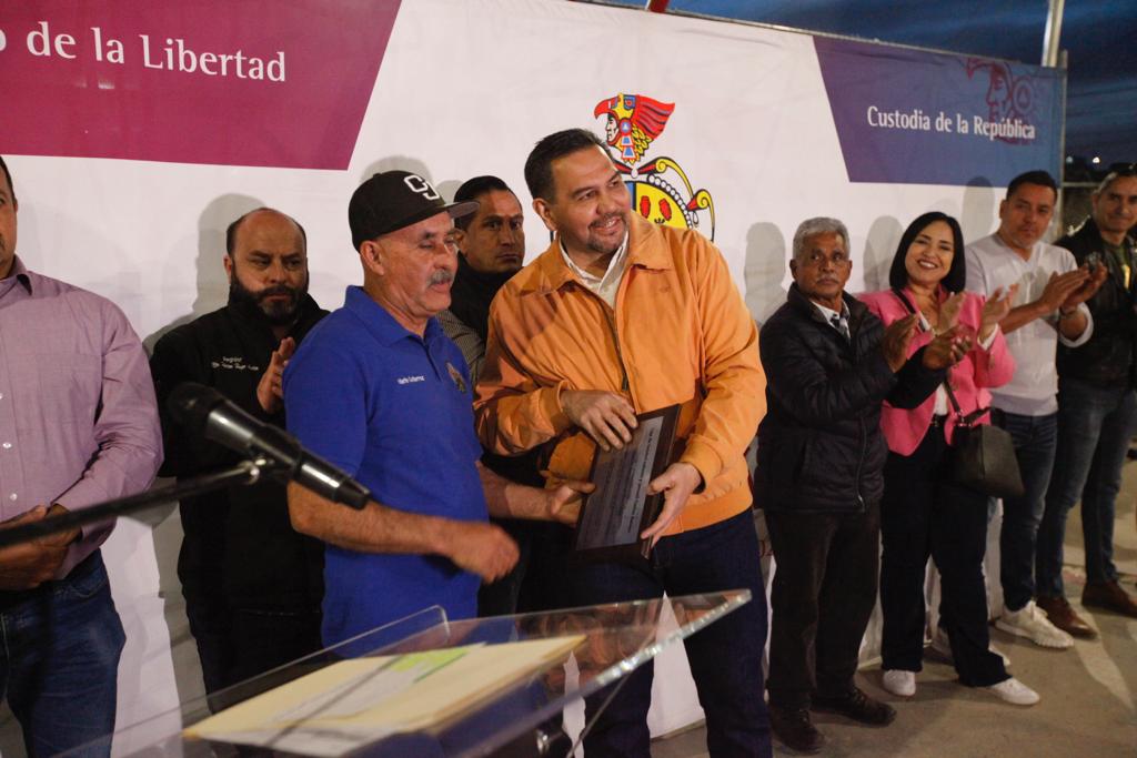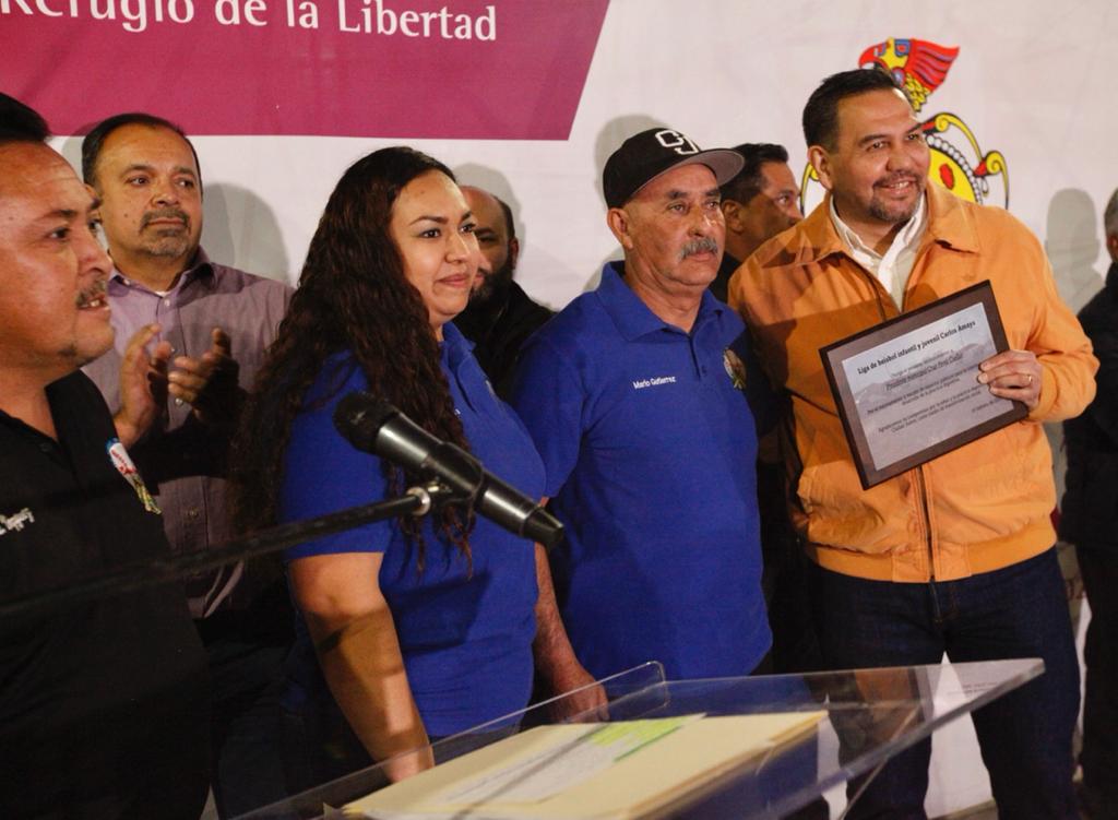Mario Gutierrez, presidente de la Liga de Béisbol Infantil y Juvenil Carlos Amaya, hizo entrega de un reconocimiento al Presidente Municipal, en agradecimiento por las acciones realizadas en el complejo deportivo que beneficiarán a la niñez juarense.