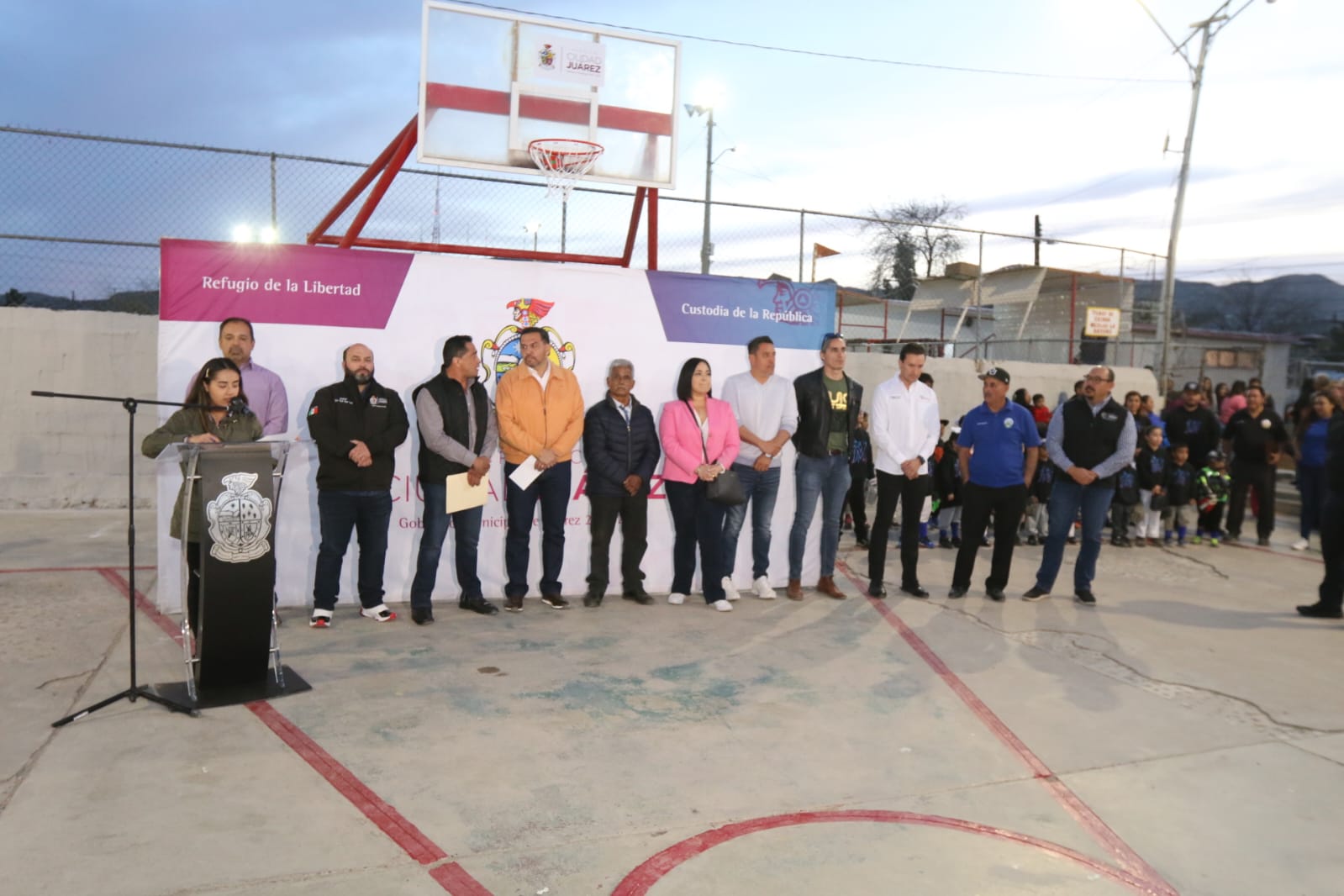 Además del alcalde Cruz Pérez Cuéllar, al evento asistieron Abraham Espitia, director de Alumbrado Público; Gibran Solís, director de Limpia; Daniel Zamarron Saldaña, director de Parques y Jardines; los regidores Pedro Matus, Hugo Avitia y Karla Escalante; Alejandro Acosta, presidente de la Asociación Alegrando a la Niñez Juarense y Mario Gutierrez, Presidente de la Liga de Béisbol Carlos Amaya.