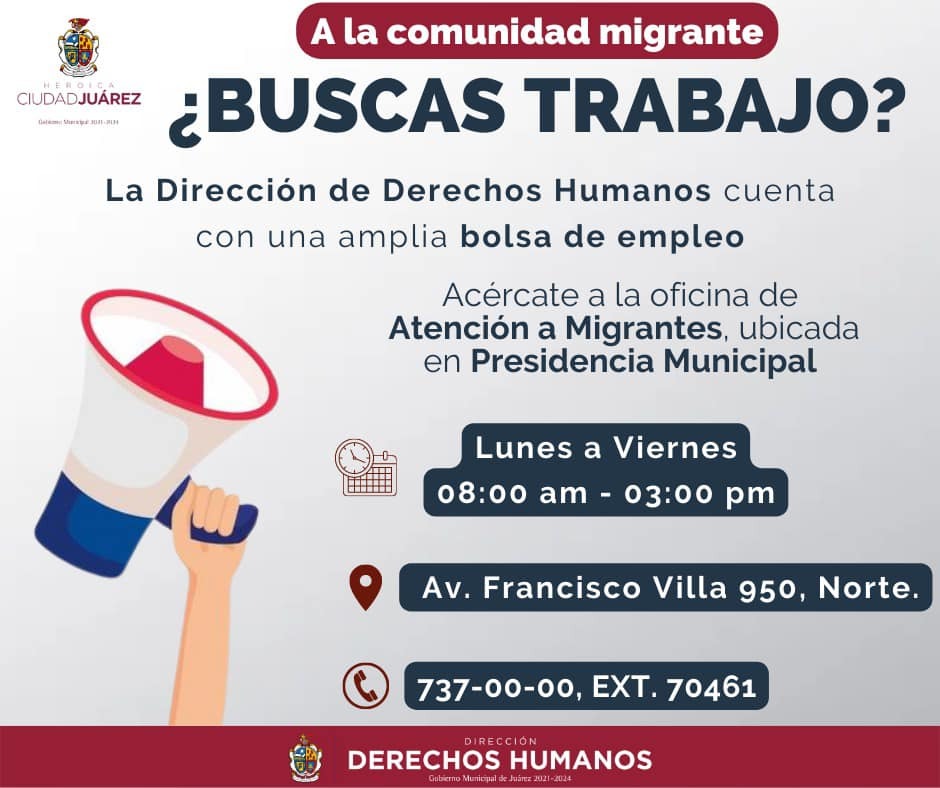 González Reyes invitó a todas las personas en situación de movilidad, para que se acerquen a la Oficina de Atención a Migrantes, ubicada en el exterior de Presidencia Municipal, la cual atiende de lunes a viernes de 8:00 de la mañana a 3:00 de la tarde, para brindar asesoría o canalizar con ofertas de trabajo.