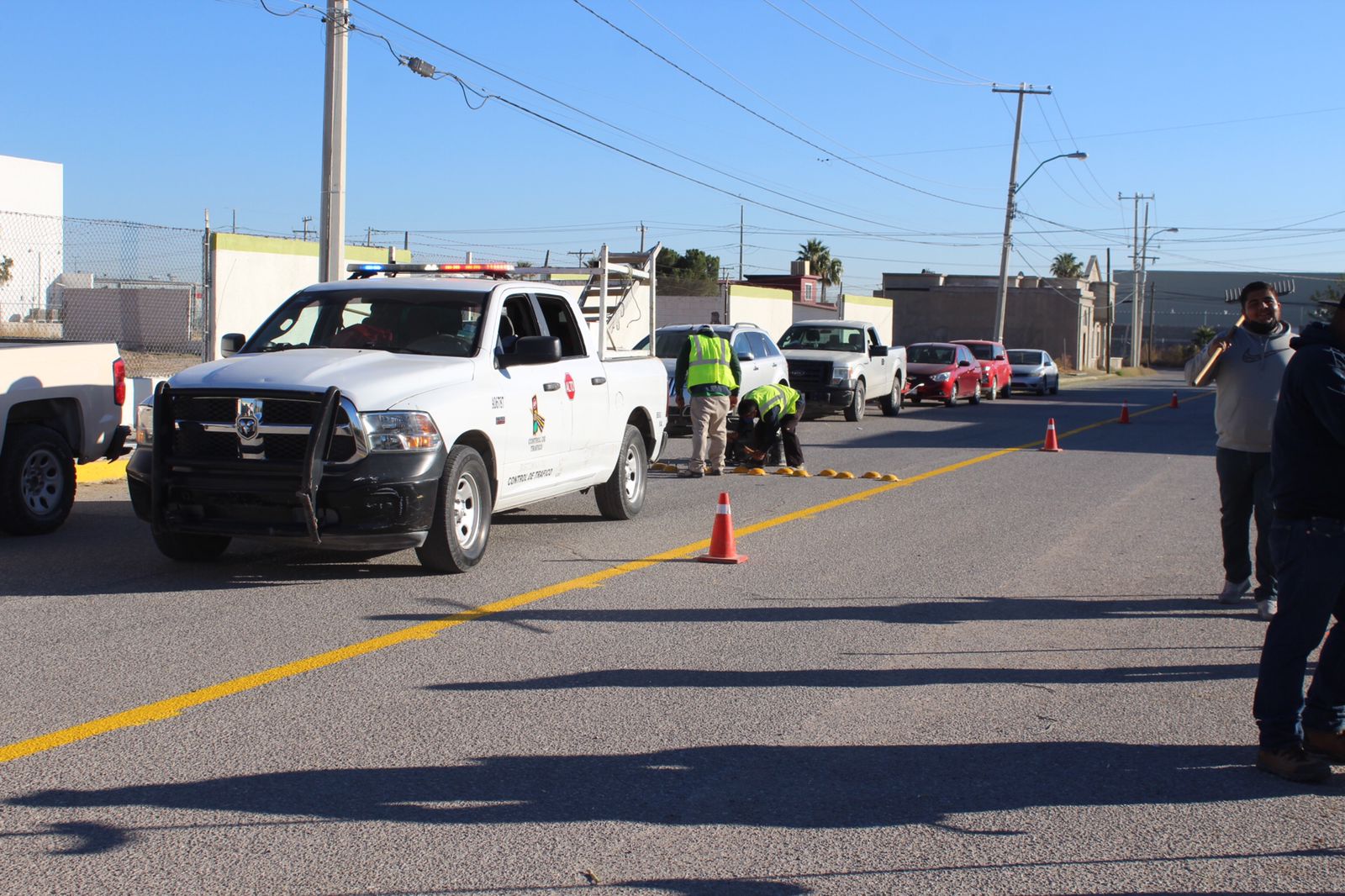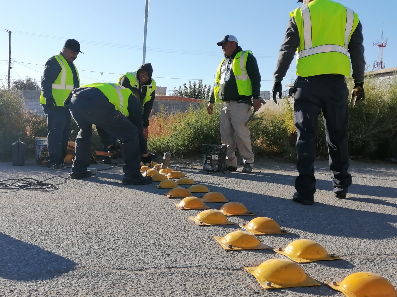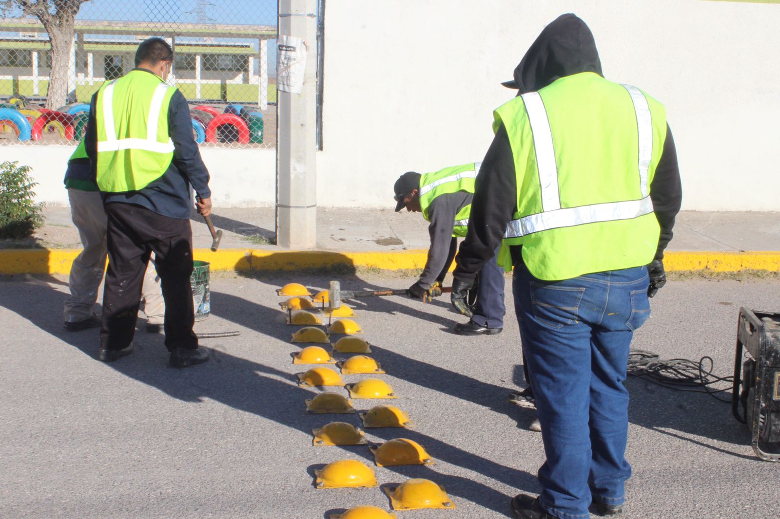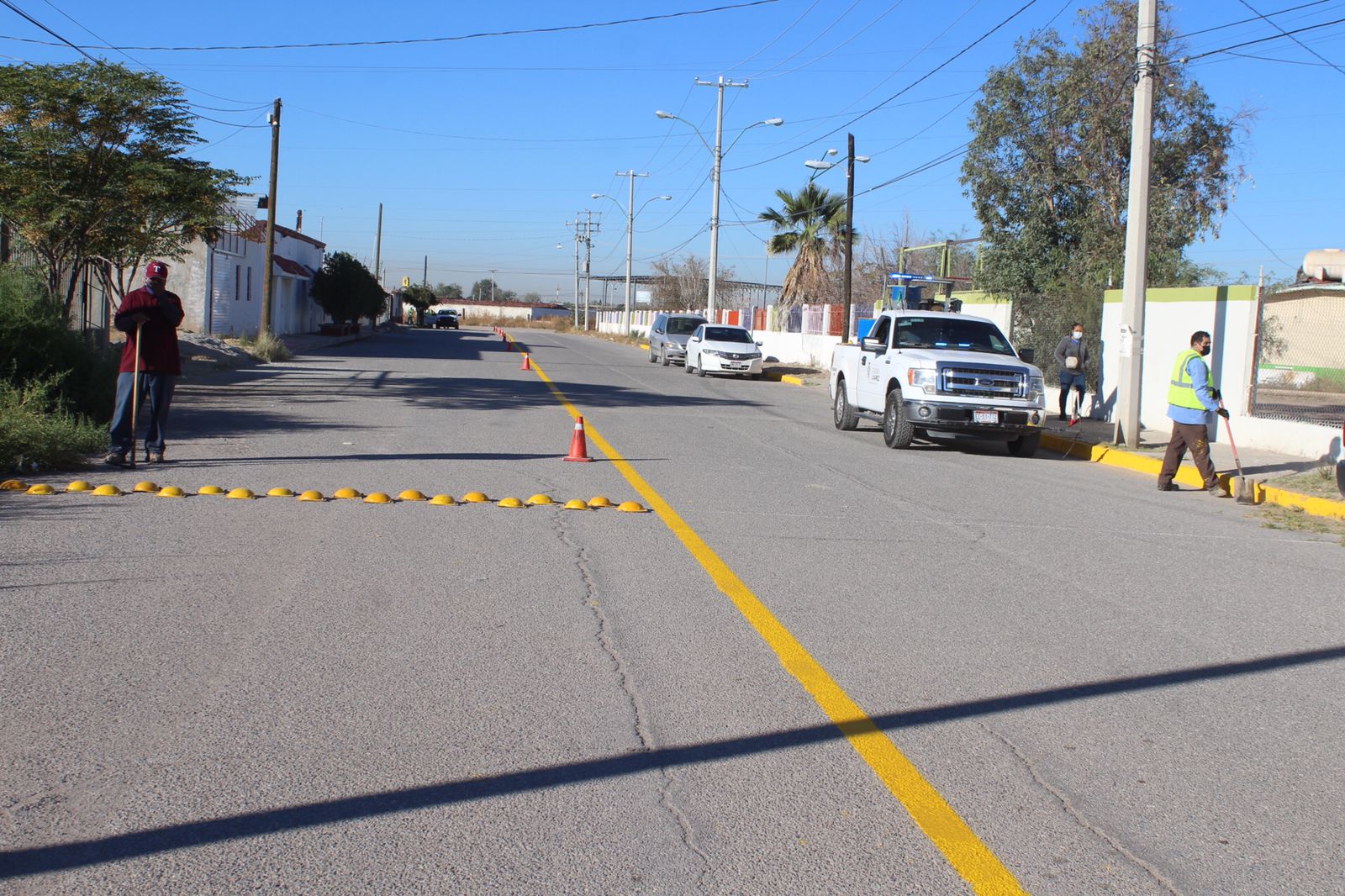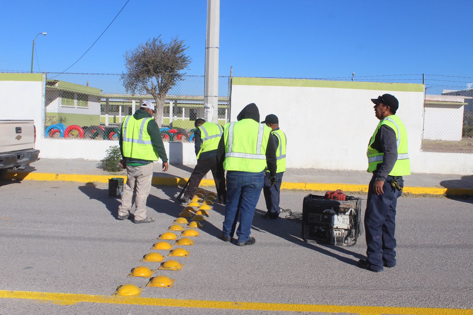 Desde temprana hora, las cuadrillas acudieron al punto para pintar la zona escolar, el cruce peatonal, cordones, eje central, rampas de discapacidad, así como la colocación de boyas y señalamientos necesarios.