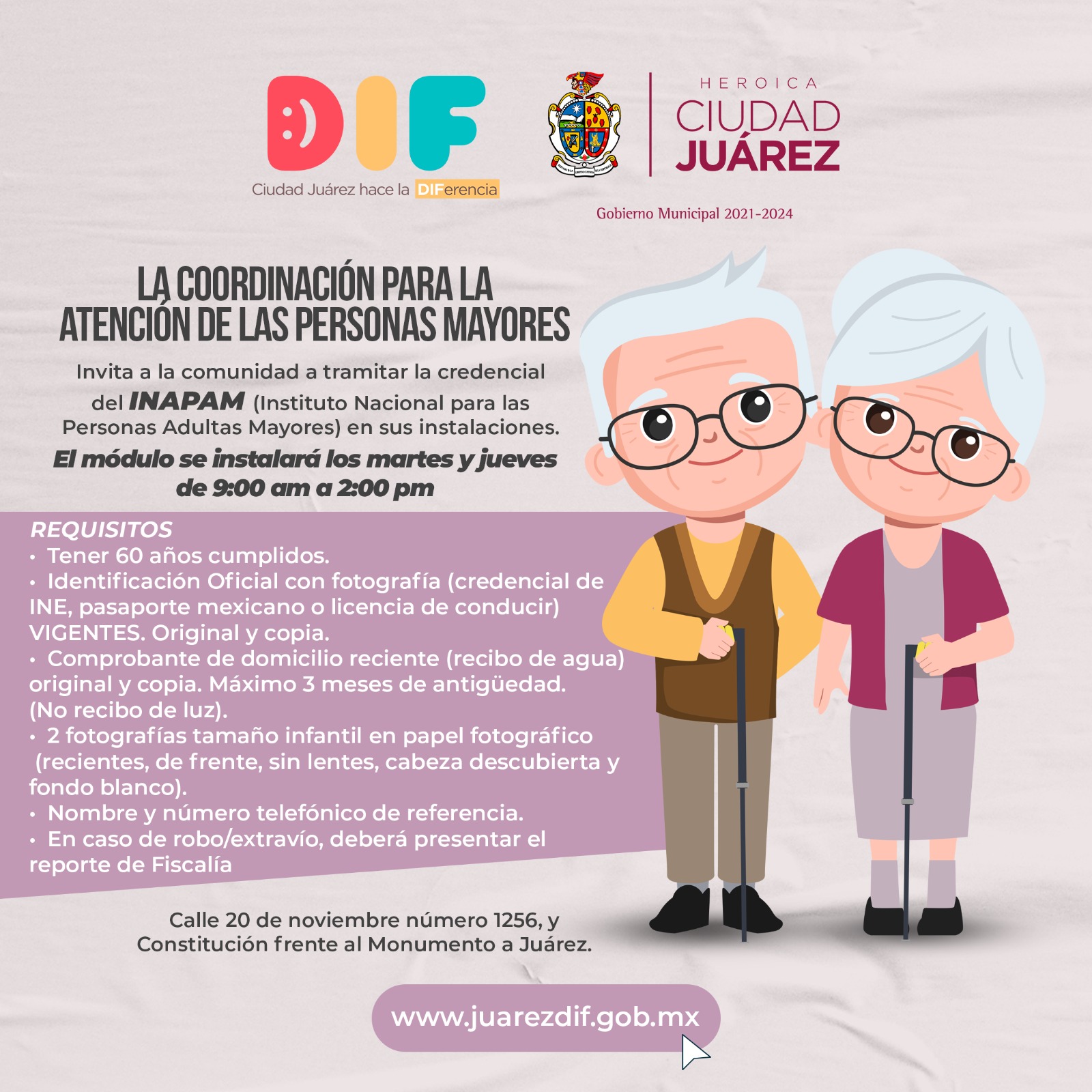 Todos los martes y jueves, desde las 8:00 de la mañana hasta las 2:00 de la tarde, se estará haciendo el trámite de expedición de la credencial del Instituto Nacional de las Personas Adultas Mayores (INAPAM).