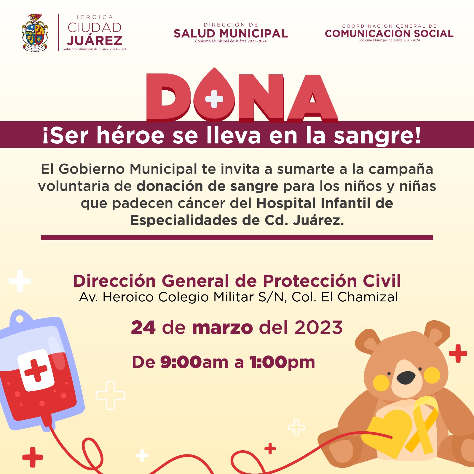 El Gobierno Municipal a través de la Dirección de Salud, invita a la ciudadanía a sumarse a la campaña voluntaria de donación de sangre para los niños y niñas que padecen cáncer y que reciben tratamiento en el Hospital Infantil de Especialidades de Ciudad Juárez.