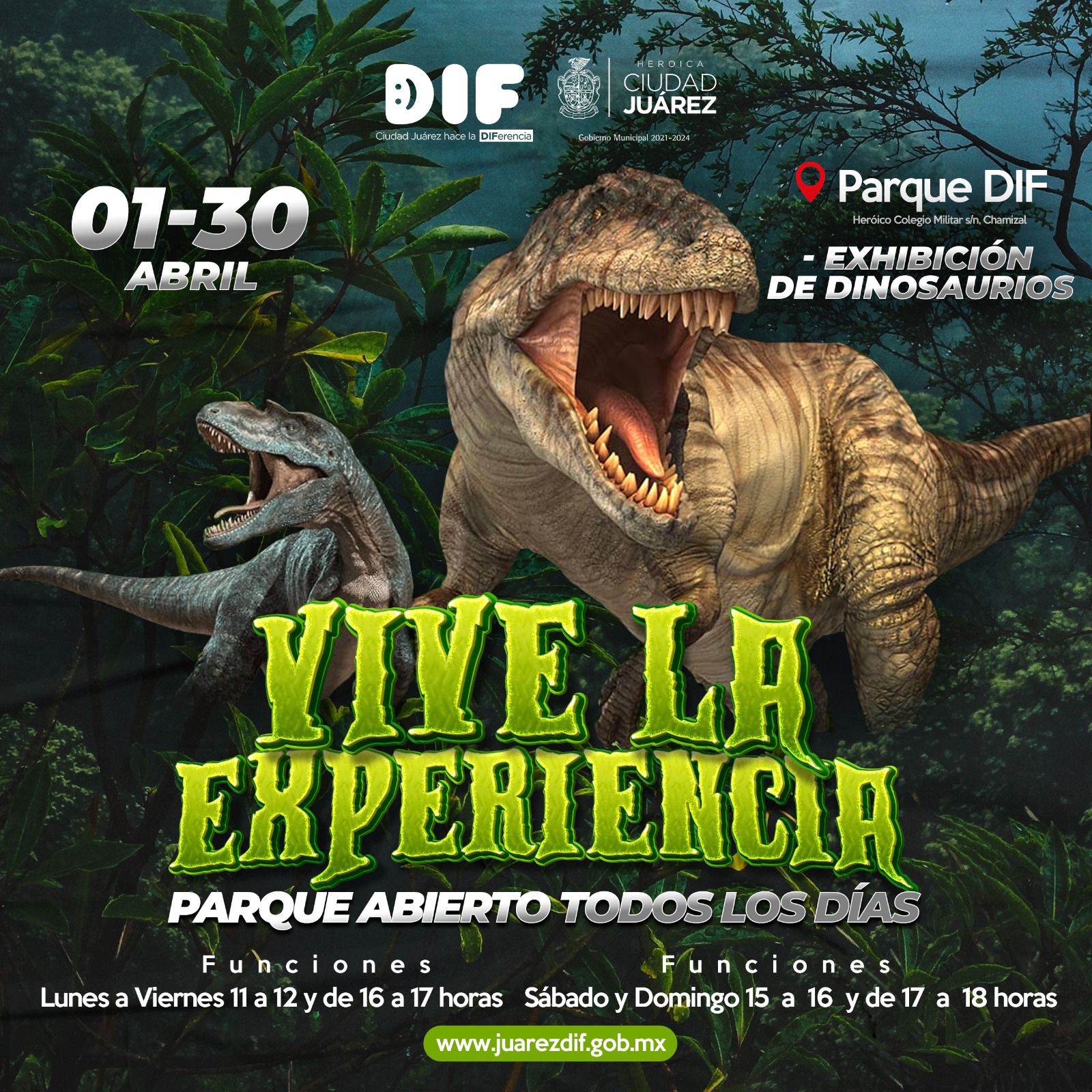 El Parque DIF y el festival ??Infancias Salvando el Planeta? abrirá sus puertas a partir del sábado primero de abril a las 10:00 de la mañana y cerrará a las 6:00 de la tarde, con el mismo horario para los domingos. De lunes a viernes la actividad para el público en general será de las 3:00 y hasta las 6:00 de la tarde, pues durante las mañanas se estarán recibiendo escuelas de zonas de alta vulnerabilidad.