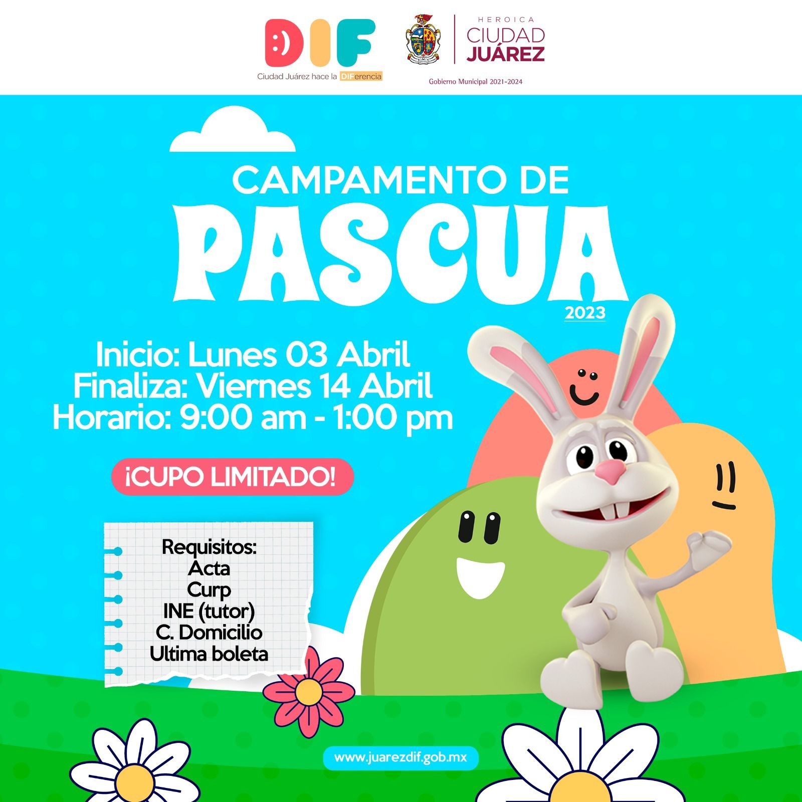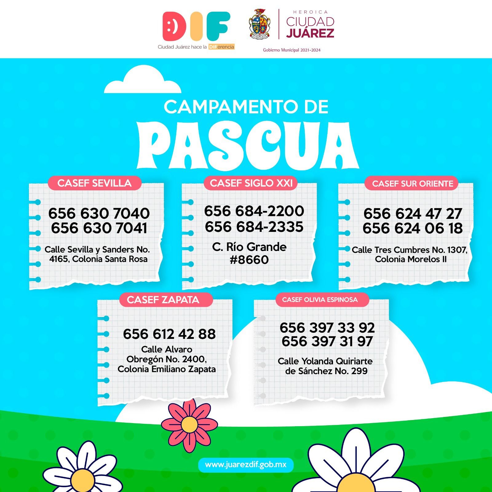 La presidenta de DIF extendió la invitación a los Campamentos de Pascua en los Centros de Atención Social y Educativos para las Familias (CASEF) en sus cinco ubicaciones, para niñas y niños en edades de los 5 a los 12 años, que se llevarán a cabo del 3 al 14 de abril en un horario de 9:00 de la mañana a una de la tarde. La cuota de recuperación es simbólica.