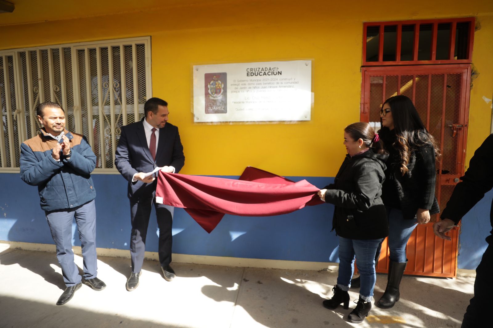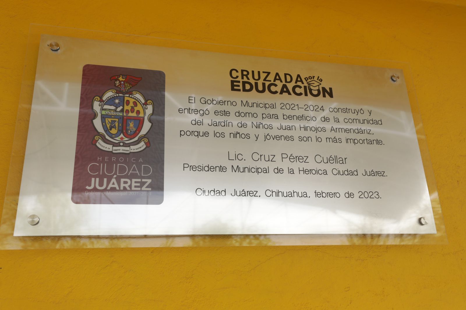 El Gobierno Municipal continúa mejorando las condiciones de infraestructura e imagen urbana de las escuelas públicas de la ciudad, en esta ocasión a través de la entrega de dos domosres, uno en la primaria Juana I. de Asbaje y el otro en el jardín de niños Juan Hinojos.
