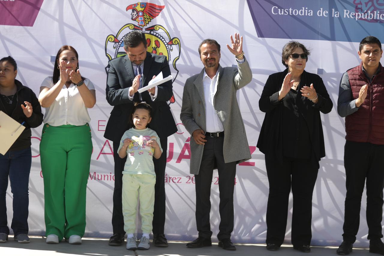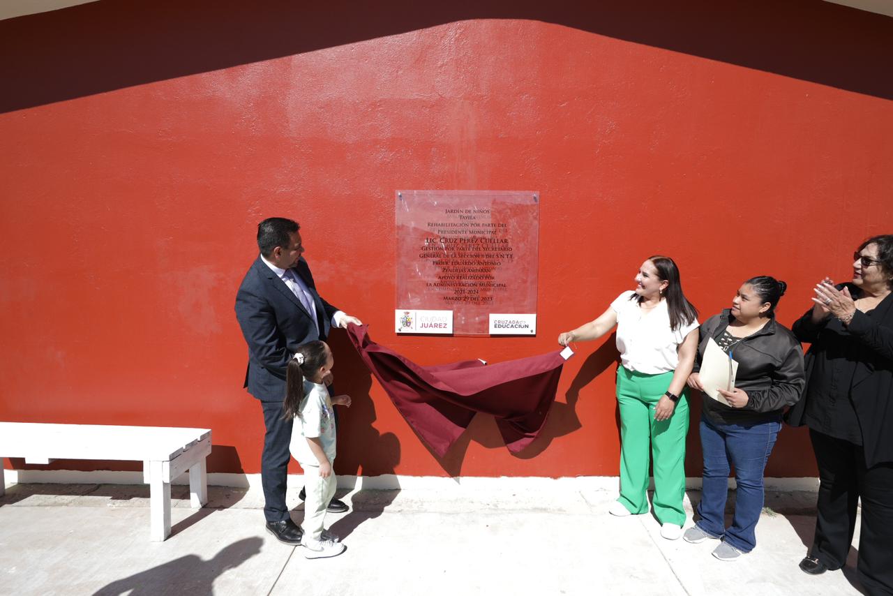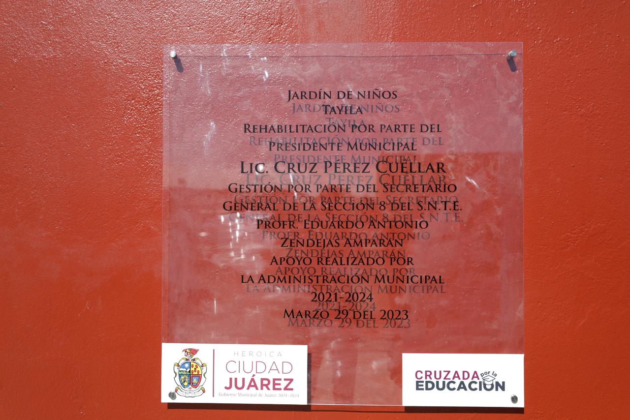 El Presidente Municipal, Cruz Pérez Cuéllar, entregó varias obras de rehabilitación en el Jardín de Niños Tayila, ubicado en la colonia Satélite.