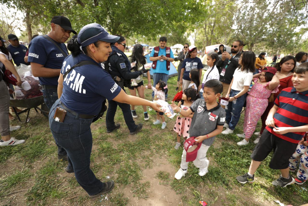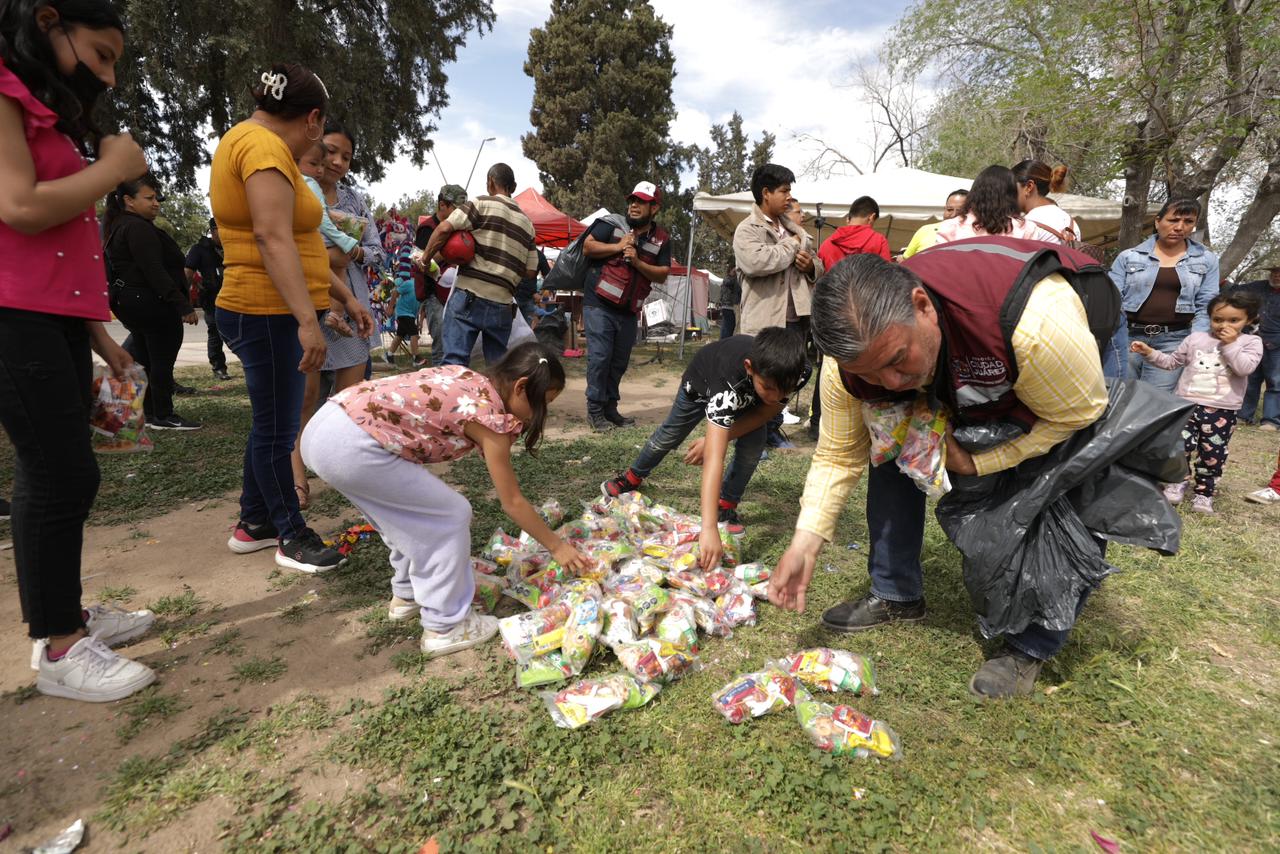 La Dirección de Atención Ciudadana organizó una celebración especial en el Parque de El Chamizal con motivo del Domingo de Pascua, donde se regalaron bolsas de dulces, gorras y máscaras a las familias que asistieron.