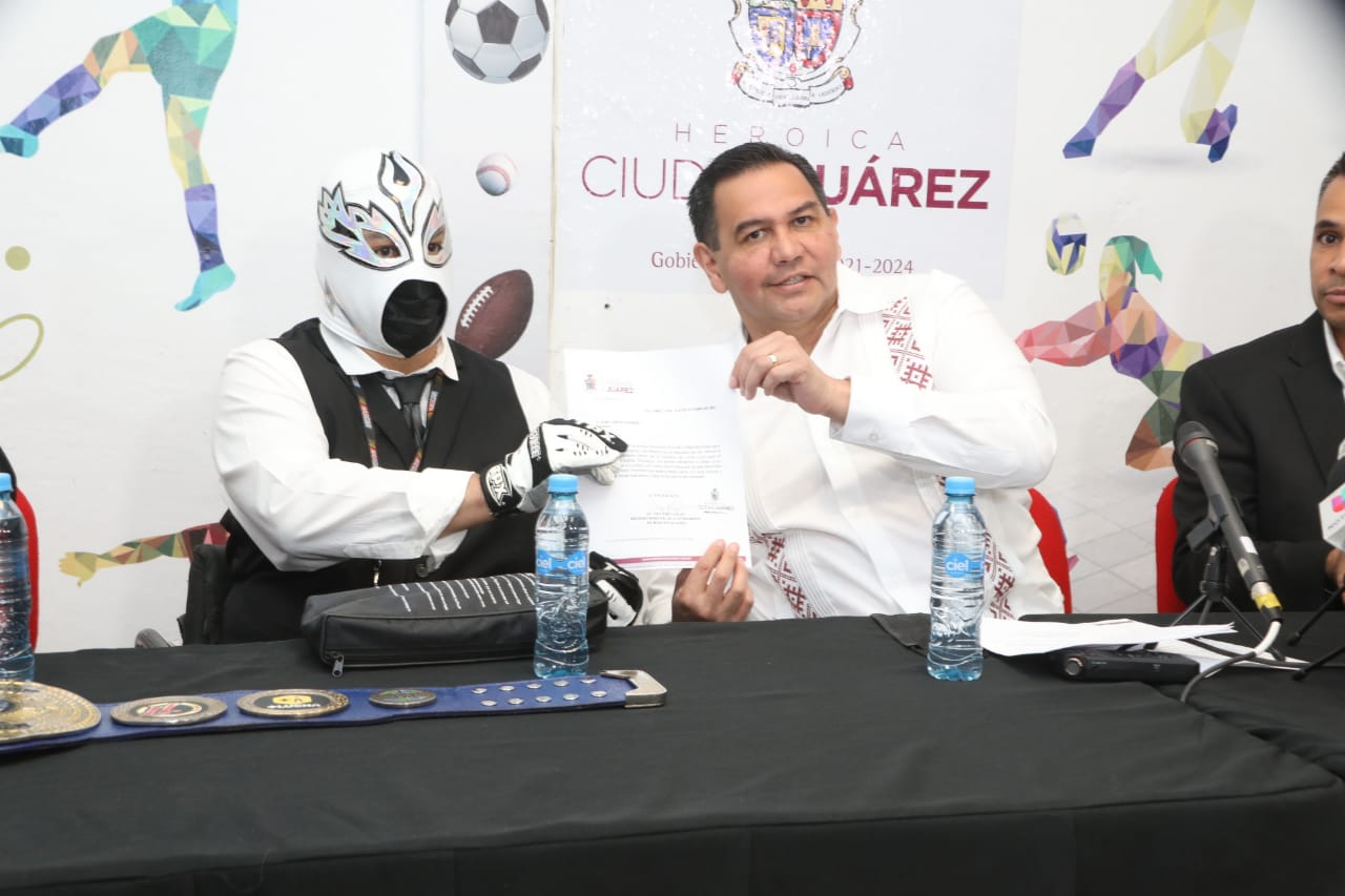 El Presidente Municipal, Cruz Pérez Cuéllar, acompañado del director del Instituto Municipal del Deporte y Cultura Física, Juan Carlos Escalante, entregó al deportista Juan Carlos Calderón el nombramiento como nuevo Comisionado de la Lucha Libre en Ciudad Juárez.