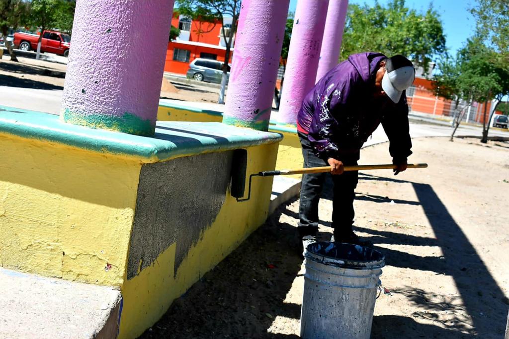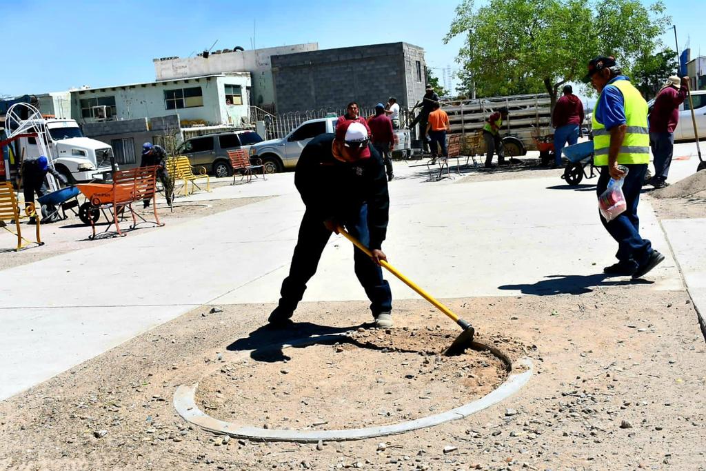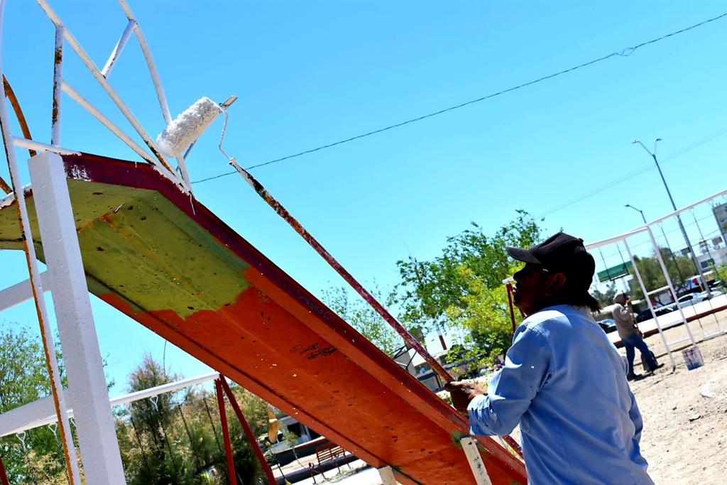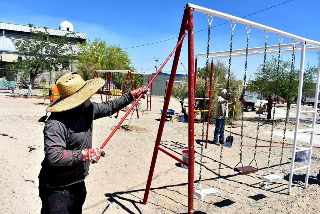 A fin de continuar mejorando los espacios públicos para que las familias juarenses puedan convivir y jugar sanamente, personal de la Dirección General de Servicios Públicos, trabaja en el mantenimiento general del parque Comex, ubicado en la colonia Tierra Nueva I.