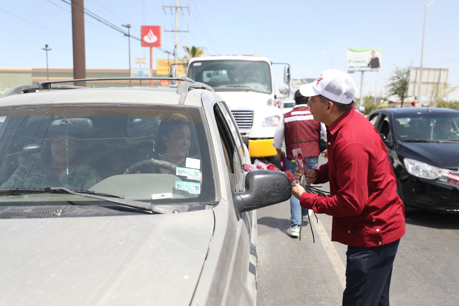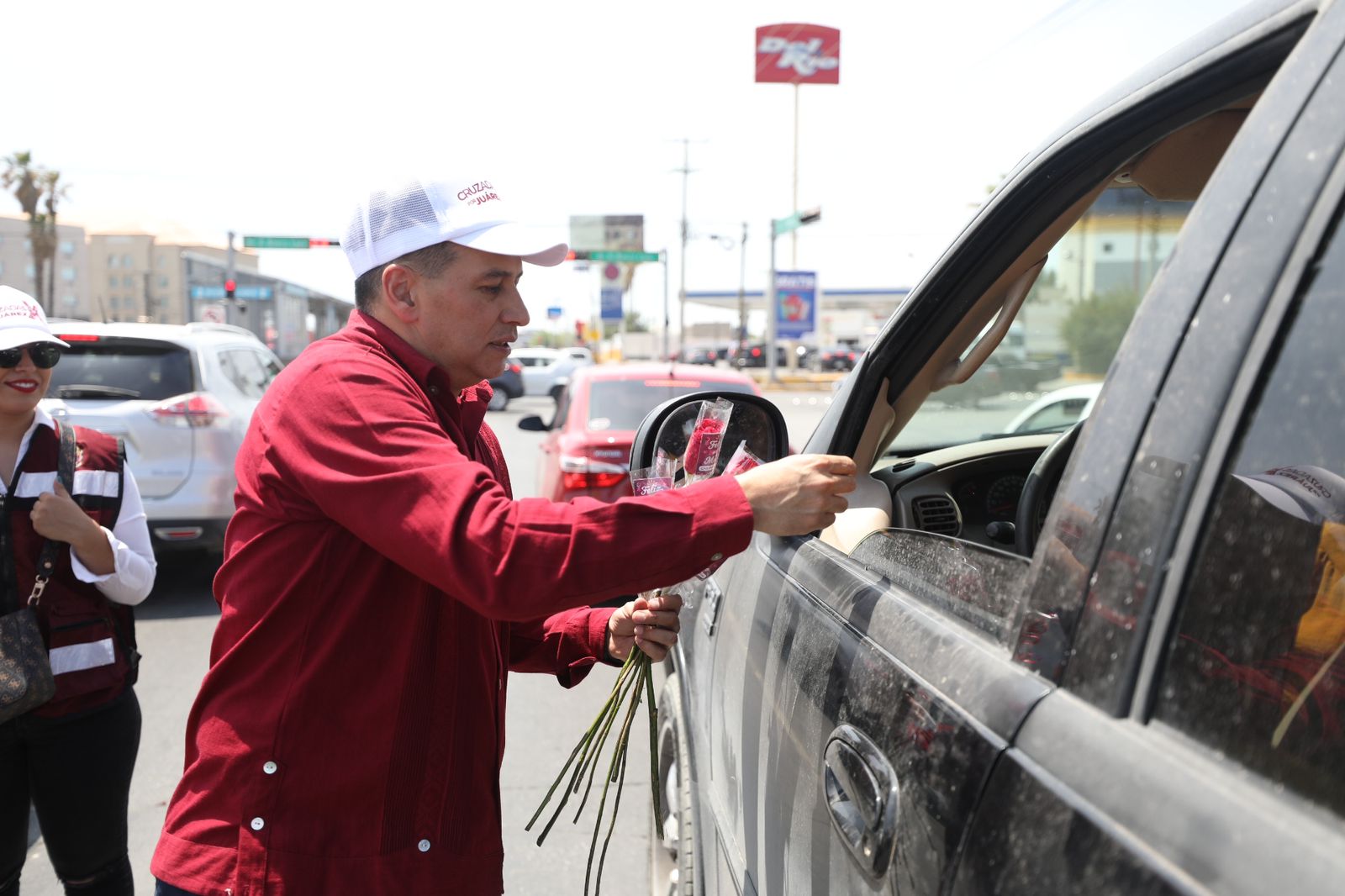 Acompañados de un contingente de 120 personas en cruceros, restaurantes y diversos puntos de la ciudad el Presidente Municipal, Cruz Pérez Cuéllar, su esposa Rubí Enríquez y su hermano Alejandro continuarán recorriendo la ciudad con el fin de entregar 20 mil rosas a las madres de familia.