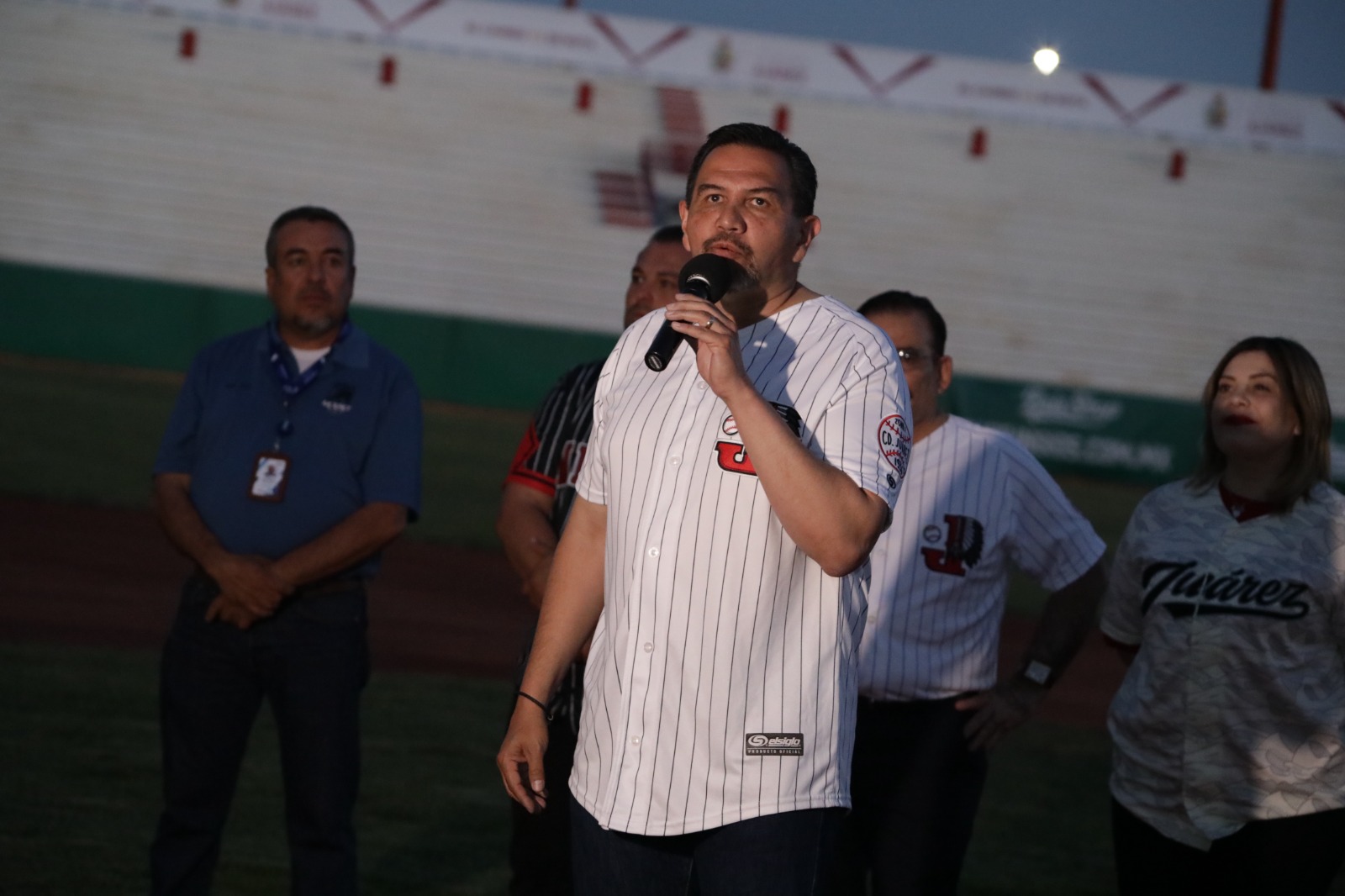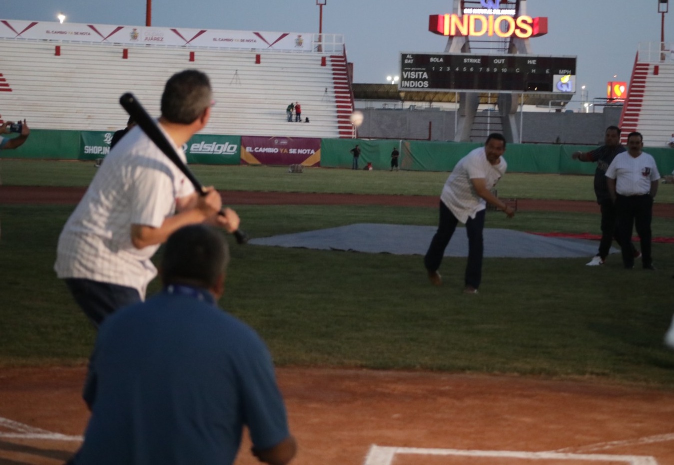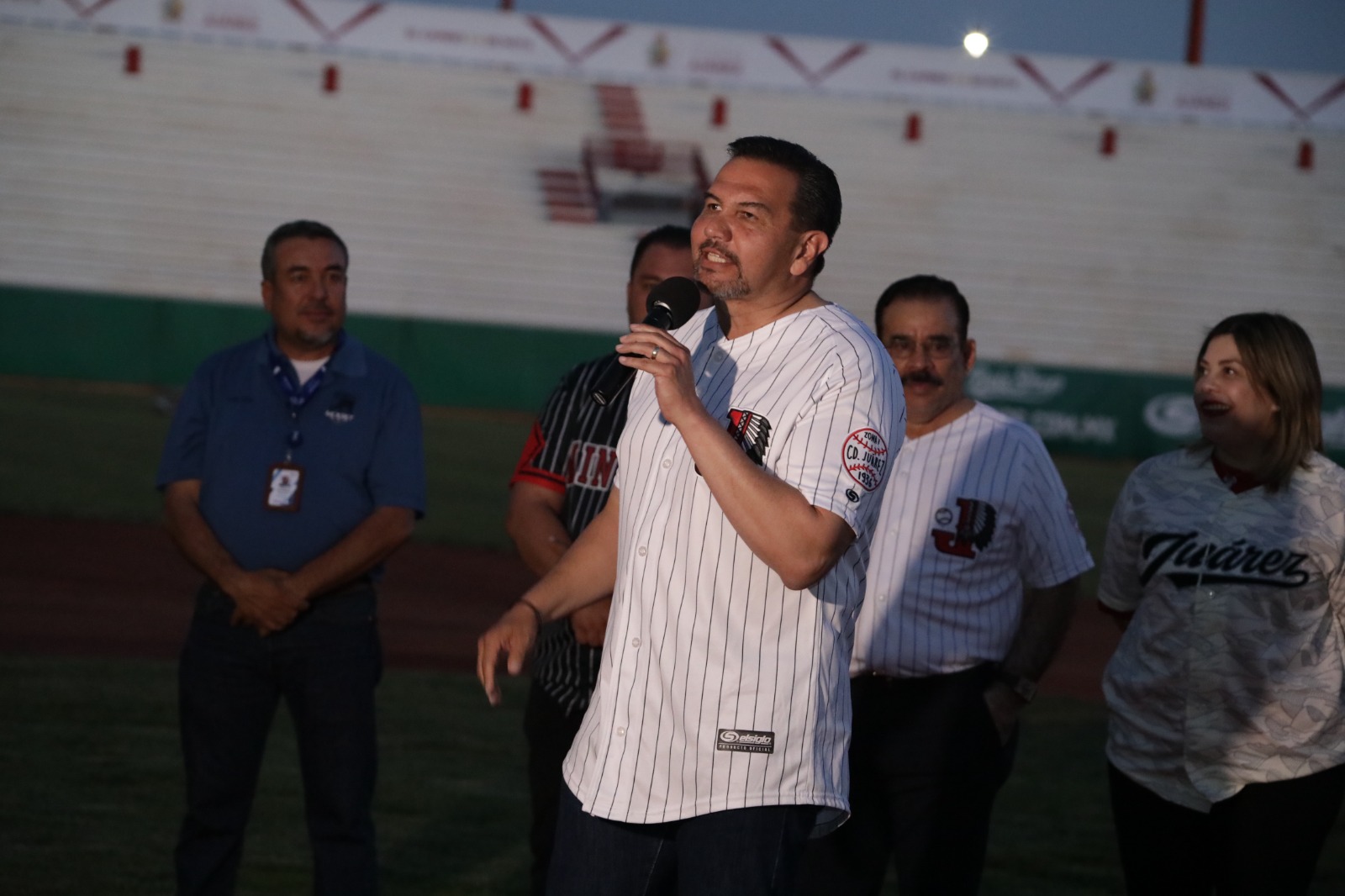 El Presidente Municipal, Cruz Pérez Cuéllar, lanzó la primera pelota en el juego en el que los Indios de Juárez recibieron a los Mineros de Parral en el arranque de la Temporada 2023 de la Liga Estatal de Béisbol (LBE).