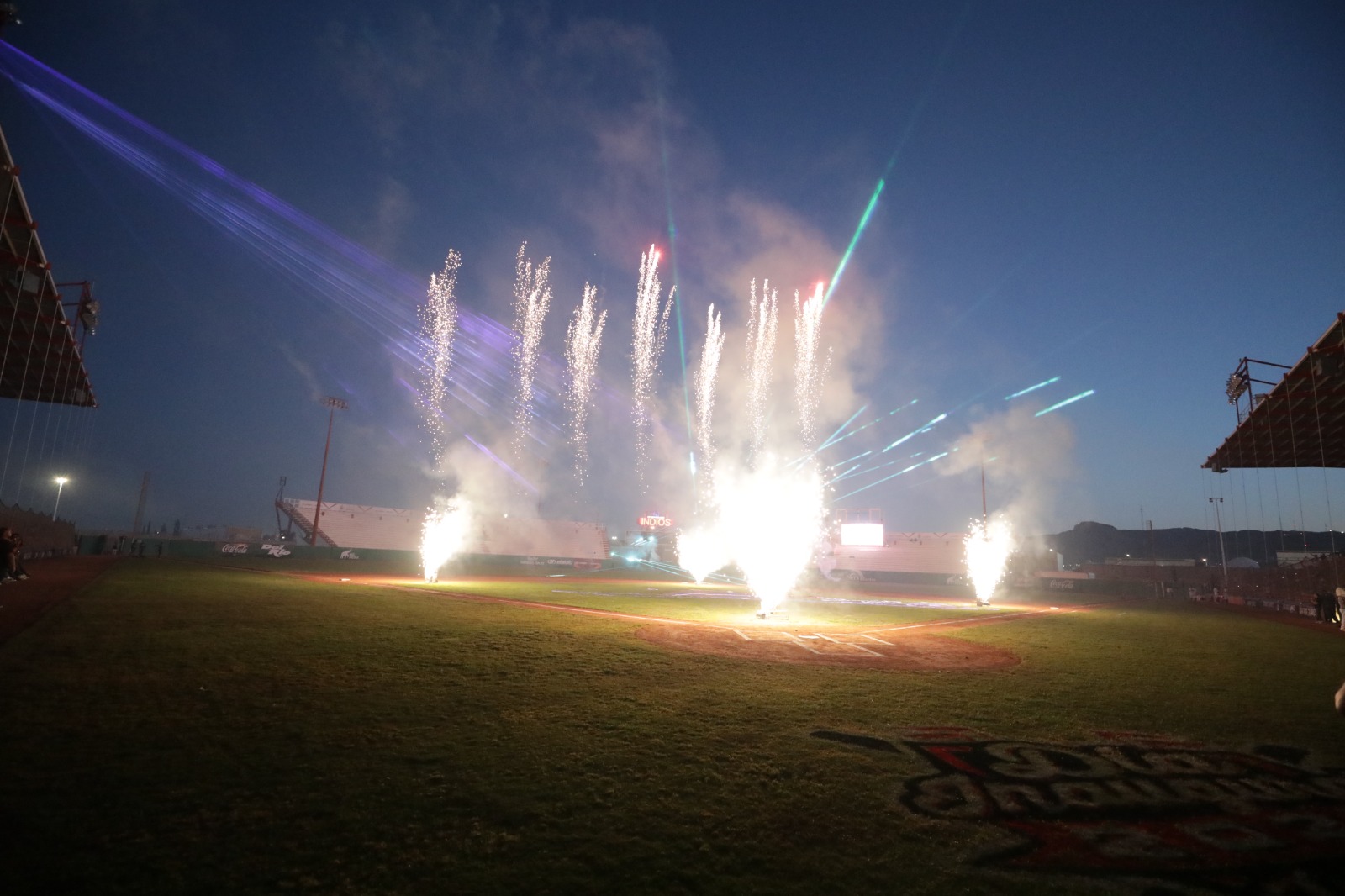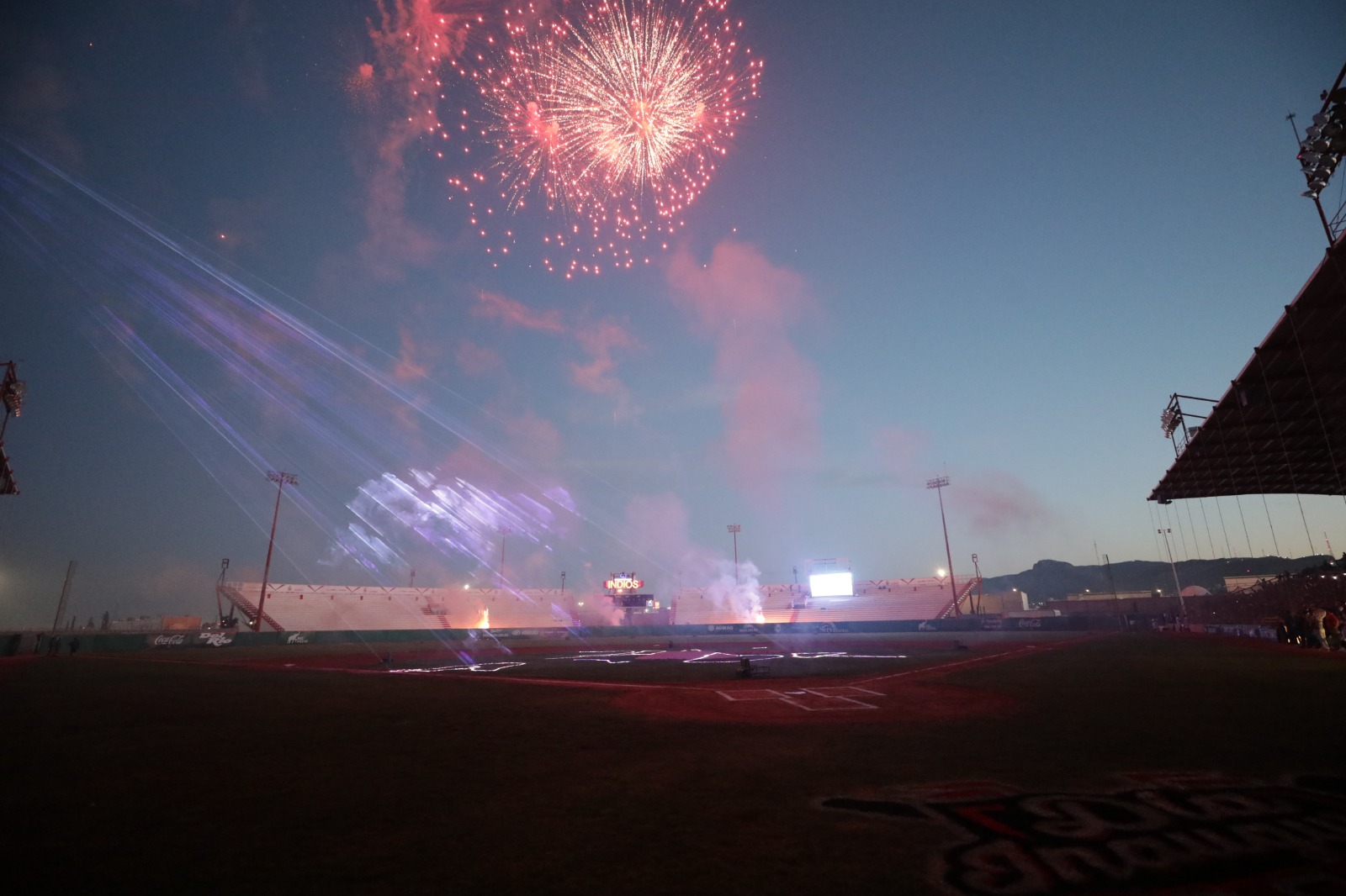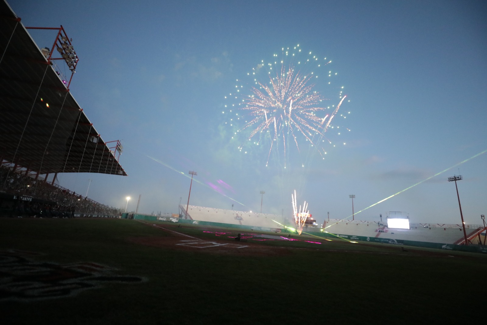 La directiva del Club Indios de Béisbol preparó un espectáculo de luces, sonido y fuegos artificiales, y se escucharon canciones de Juan Gabriel y otros artistas.