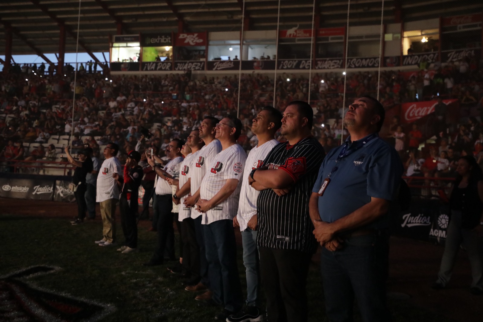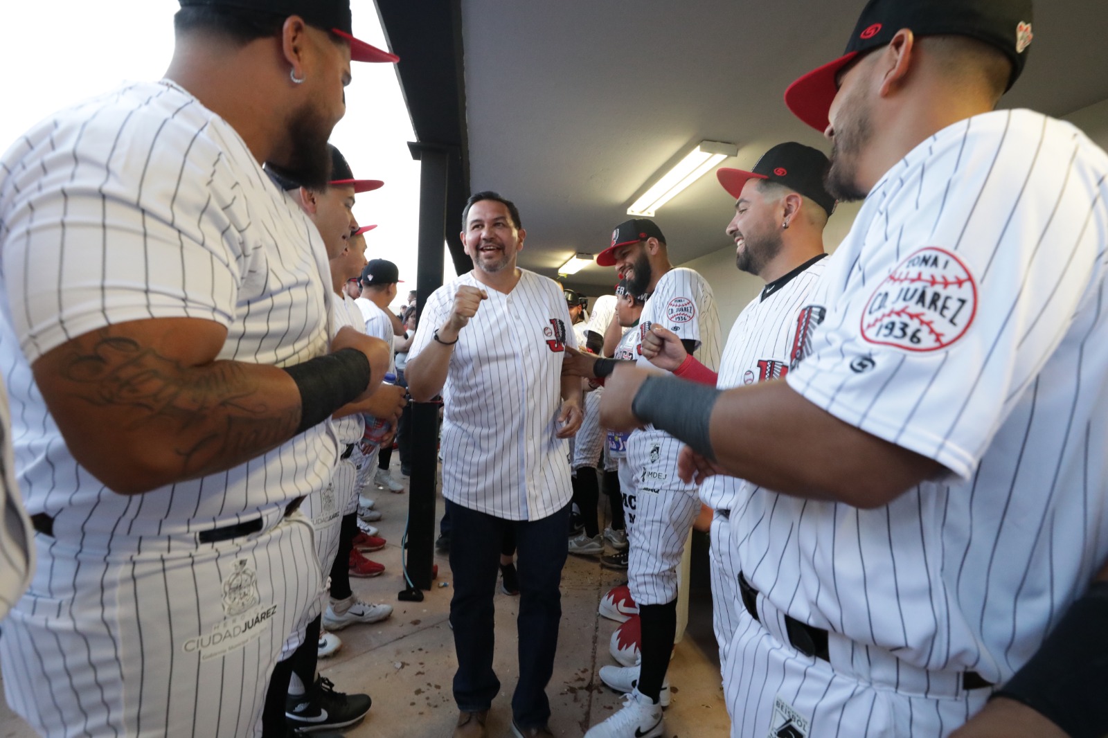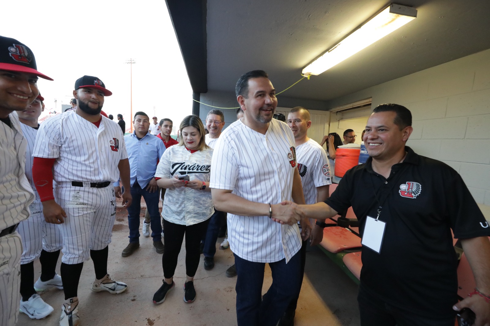Al final de la ceremonia el alcalde ingresó al ??dugout? para saludar a los jugadores de los Indios de Juárez, ellos hicieron un pasillo de honor para agradecer el apoyo del edil.