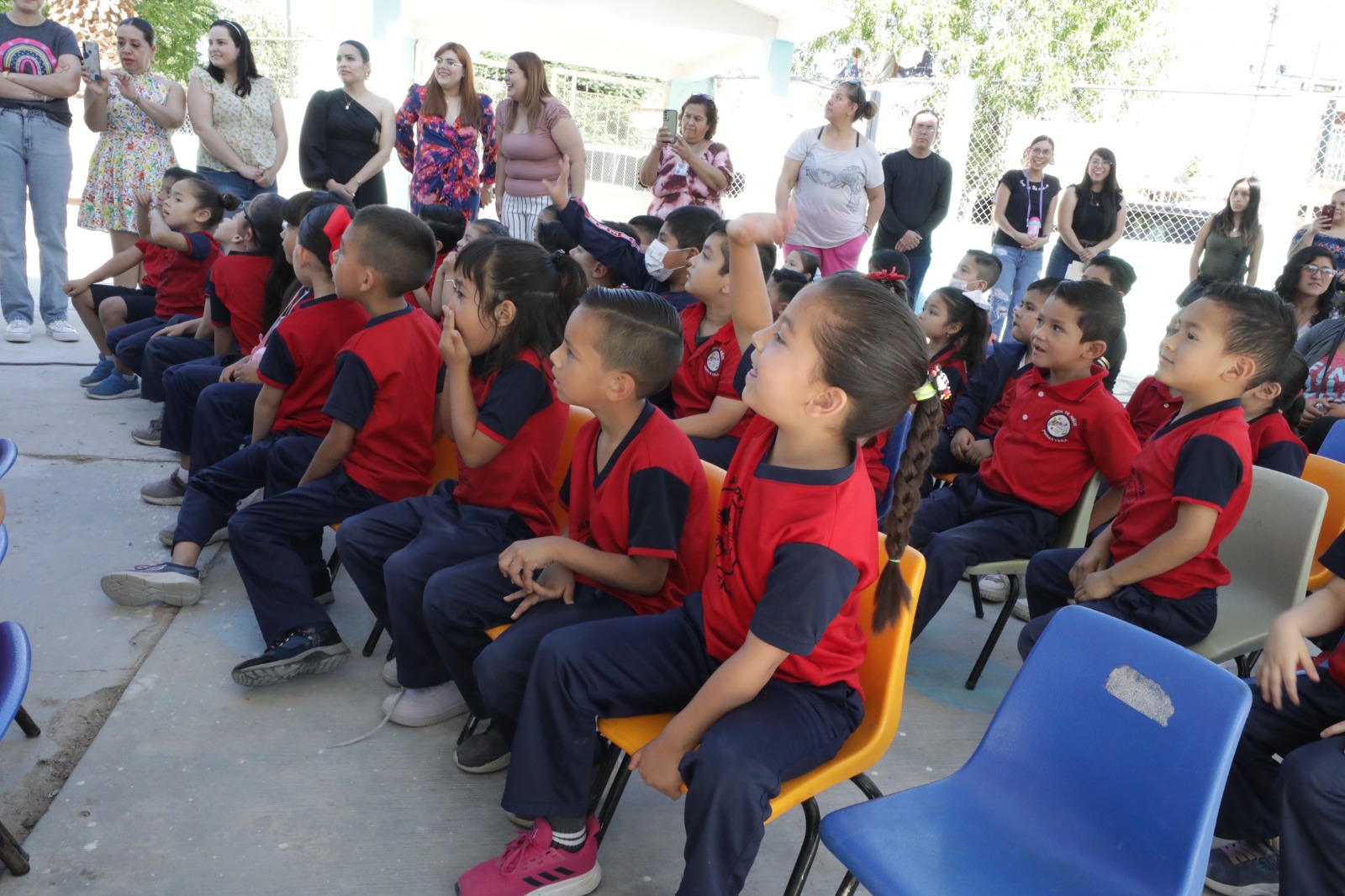 Los niños del Jardín de niños Primavera, ubicado en la colonia Morelos agradecieron al Presidente Municipal, Cruz Pérez Cuéllar, por la instalación de un domo que ahora les permitirá realizar actividades deportivas y culturales al exterior de las aulas.