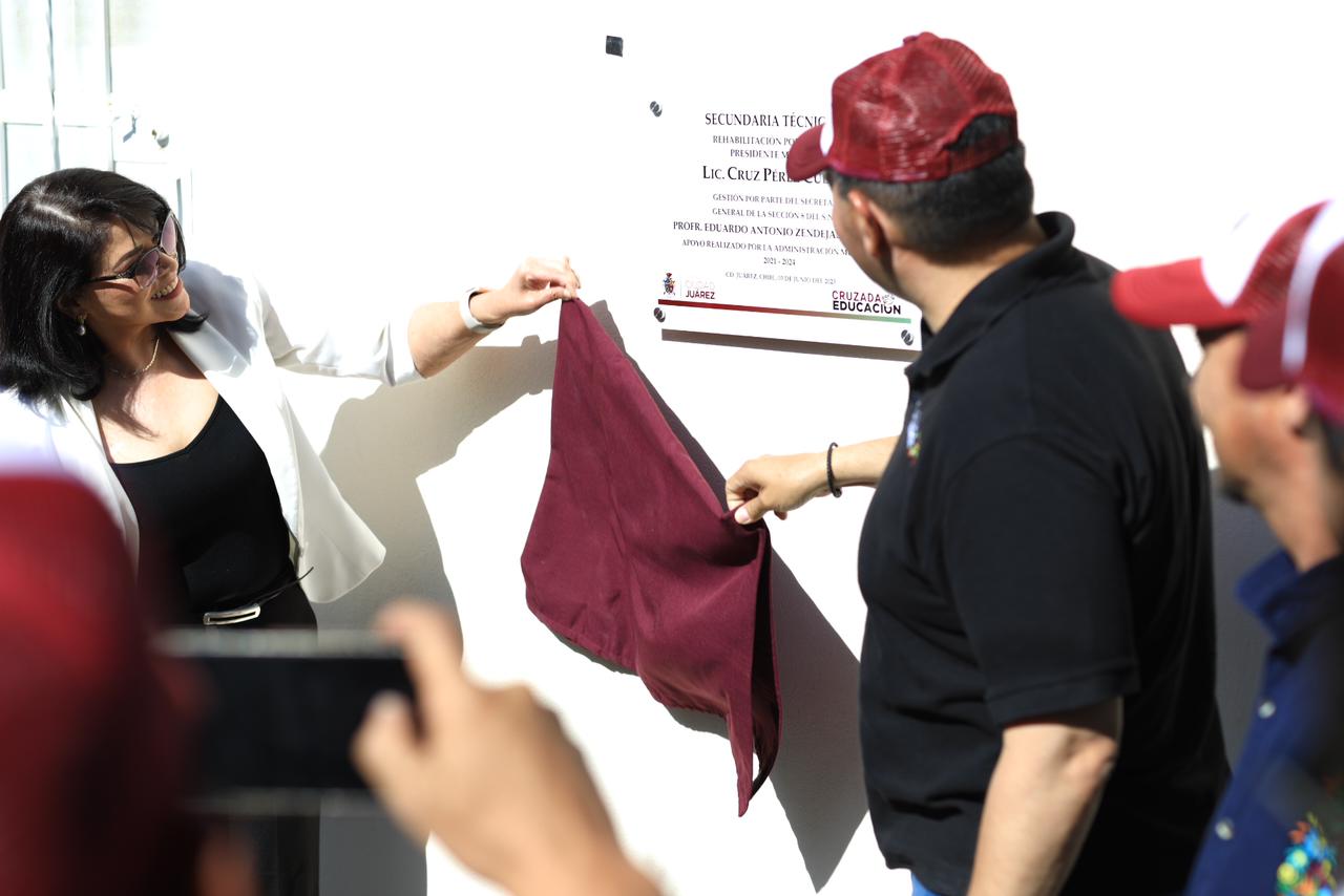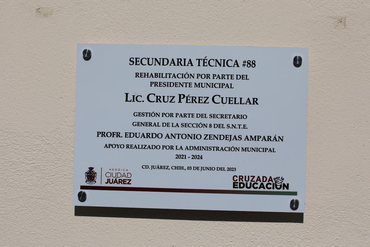 Durante el evento se develó una placa en la Escuela Secundaria Técnica 88, ubicada a un costado donde se lleva a cabo la Cruzada por Juárez, ya que el Gobierno Municipal hizo una inversión importante con la impermeabilitación de cinco edificios y pintura del exterior.