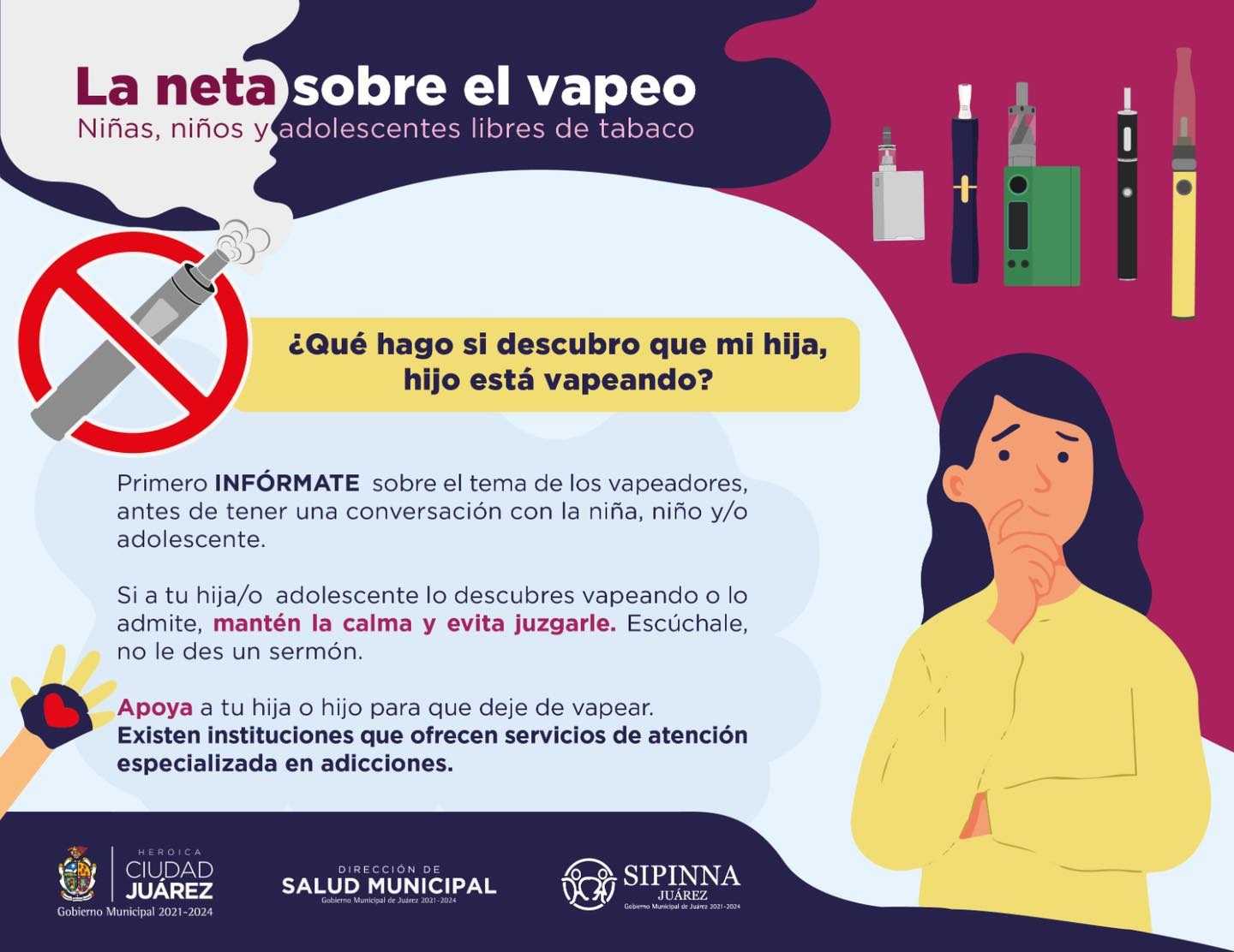 También dijo que es importante que los padres apoyen a sus hijos para que éstos dejen de vapear, pues existen instituciones que ofrecen servicios de atención especializada en adicciones.