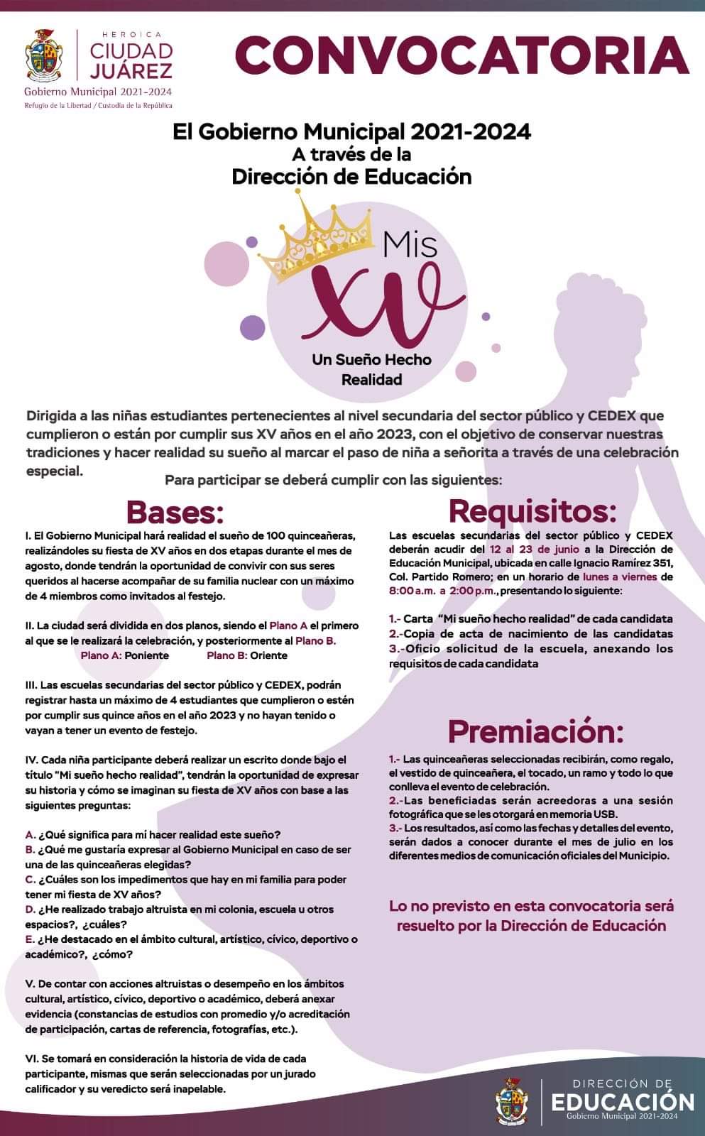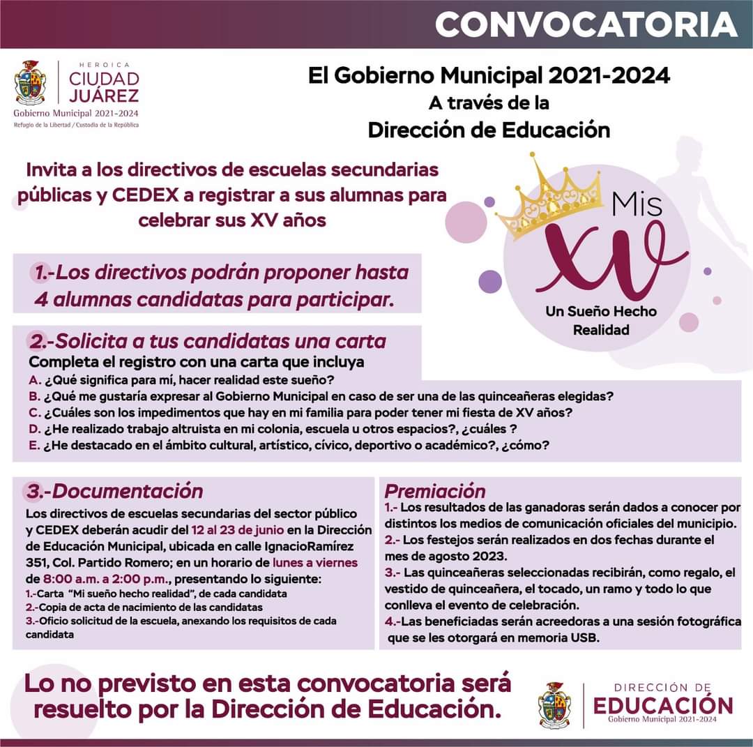 De acuerdo con la convocatoria, el Municipio hará realidad el sueño de 100 quinceañeras, organizándoles su fiesta de 15 años, por lo que a partir del lunes y hasta el 23 de junio, las escuelas deberán registrar un máximo de cuatro estudiantes que no hayan tenido o no vayan a tener un evento de festejo.