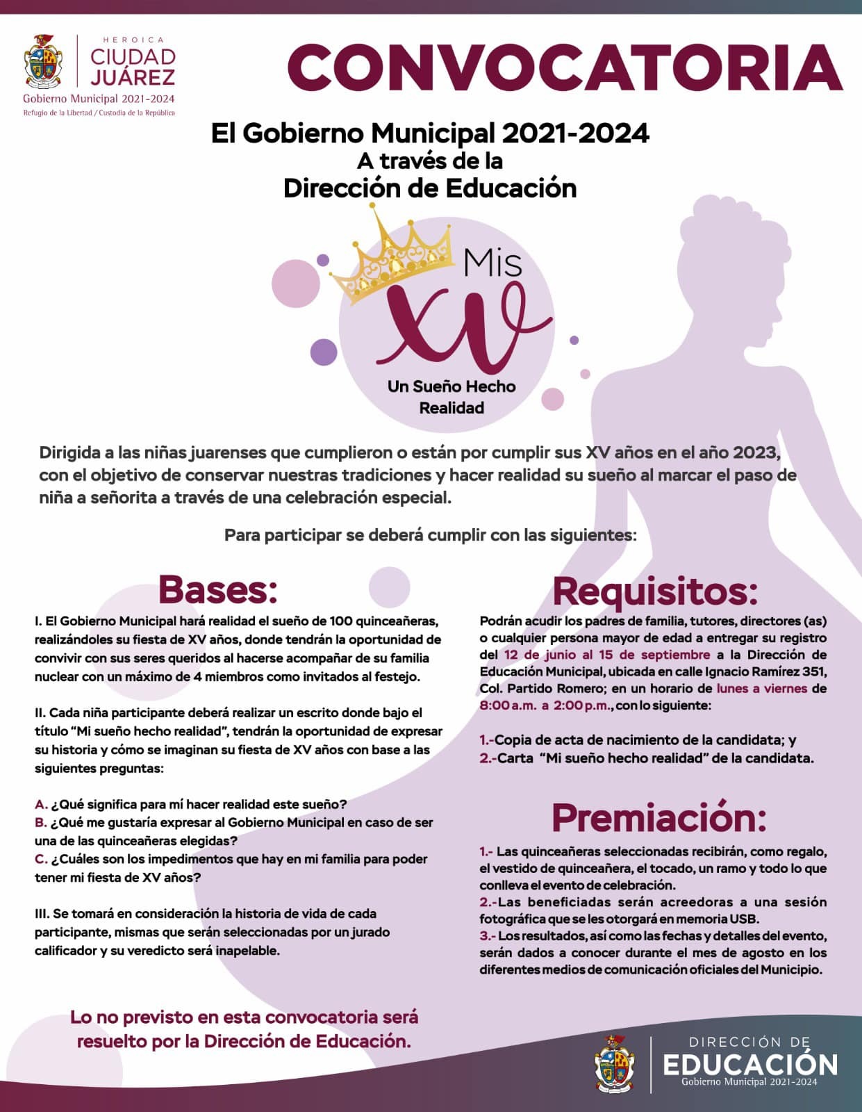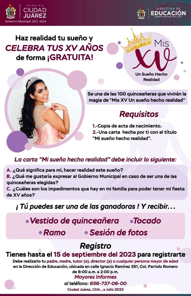 El Gobierno Municipal, a través de la Dirección de Educación, invita a las jovencitas para que participen en la convocatoria ??Mis XV, un sueño hecho realidad? y celebren de manera gratuita su cumpleaños.