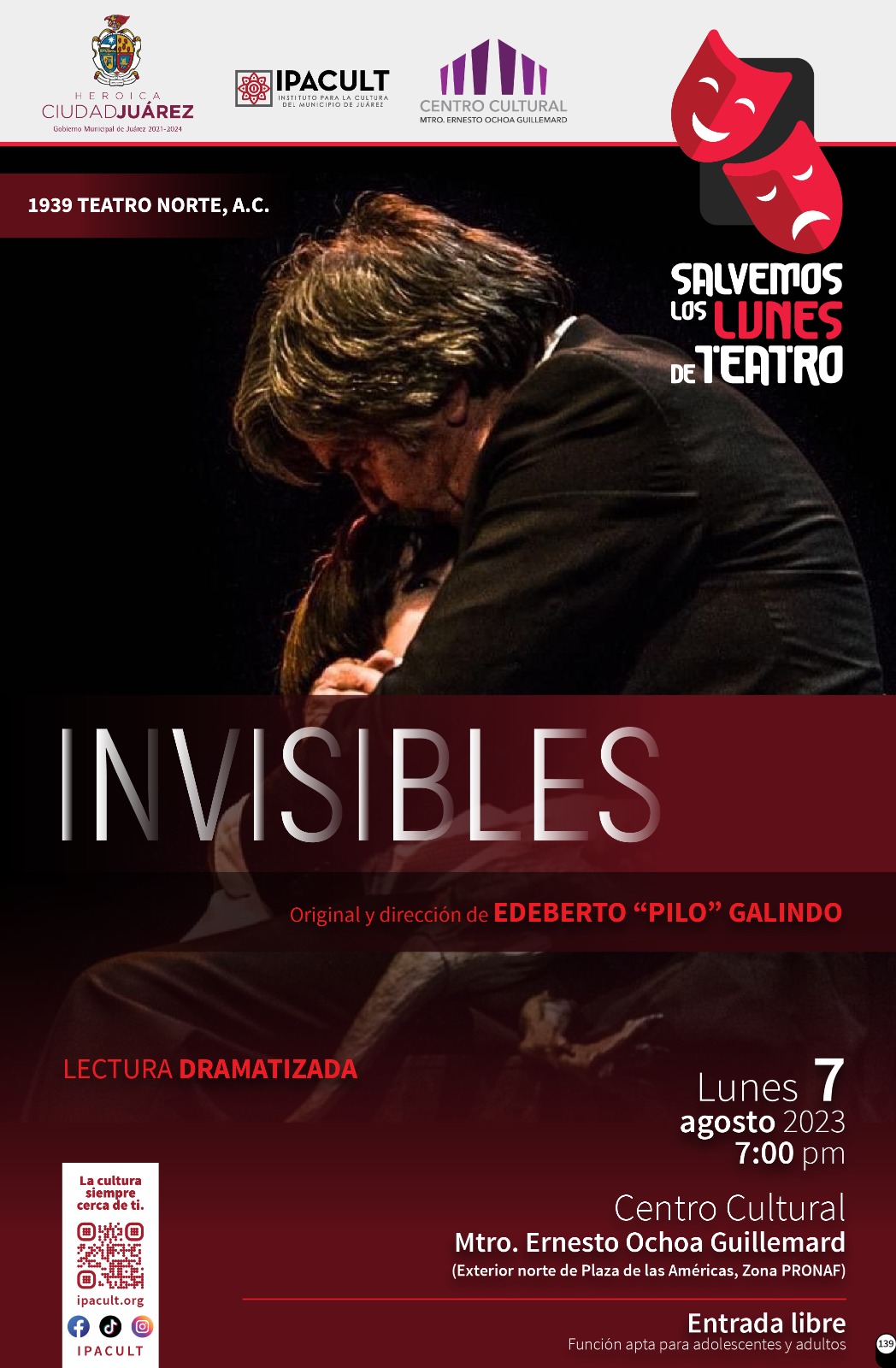 Dijo que el próximo lunes 07 de agosto, a las 7:00 de la tarde, sube al escenario del Centro Cultural ??Ernesto Ochoa Guillemard?, la obra Invisibles, texto original de Edeberto ??Pilo?? Galindo y bajo su dirección.