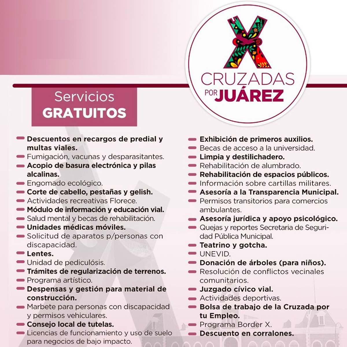 Durante el desarrollo de la Cruzada por Juárez, que se llevará a cabo este sábado 5 de agosto en el fraccionamiento Americano, Tesorería Municipal ofrecerá descuentos en el cobro de recargos por rezago en cuentas del Impuesto Predial, así como en infracciones de vialidad no consideradas graves.