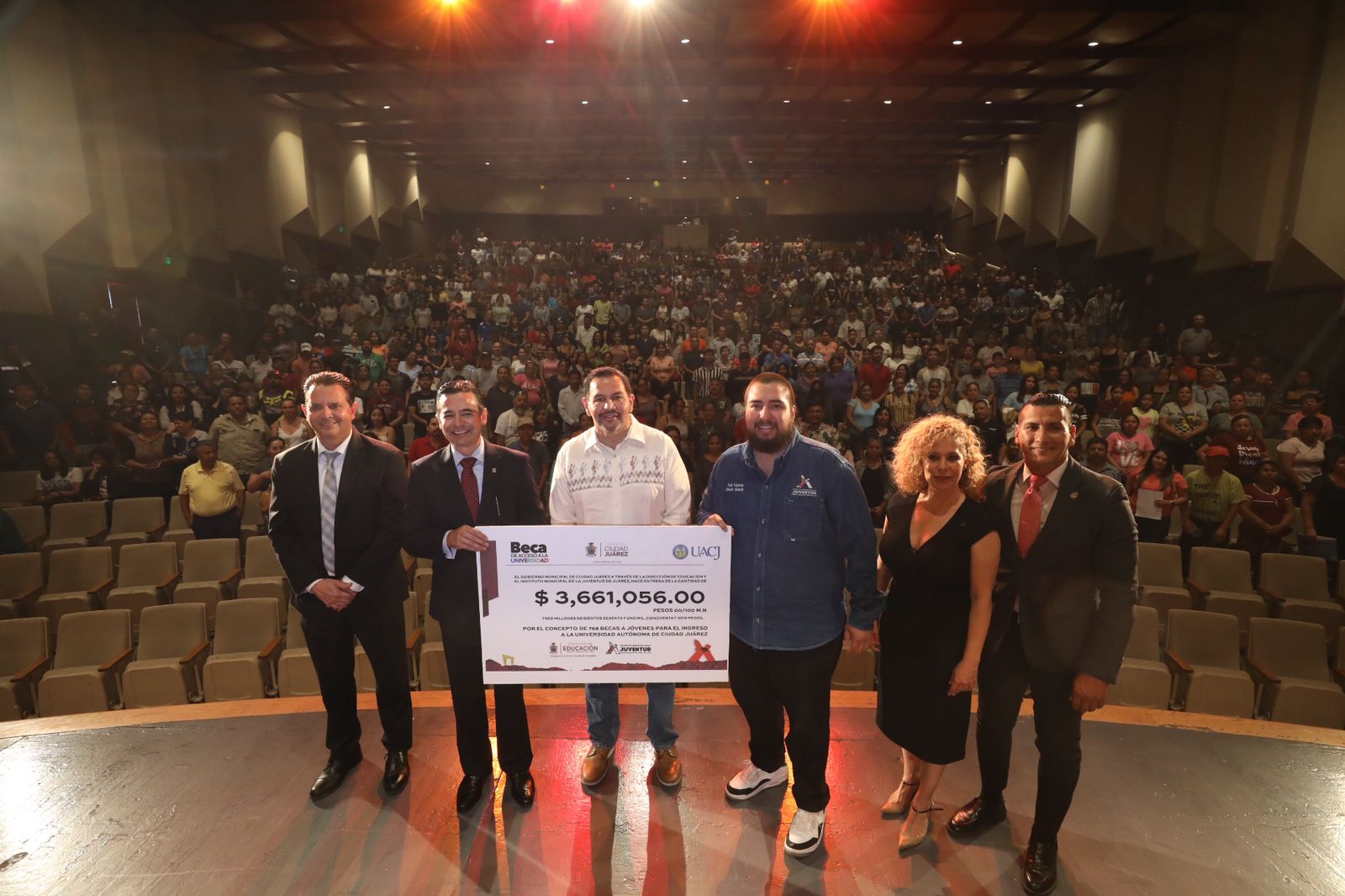 En un evento masivo que se llevó a cabo en el Auditorio Municipal Benito Juárez, el alcalde destacó que Juárez es el único municipio del país que cuenta con el Programa de Becas de Acceso a la Universidad, dirigido a jóvenes que carecen de recursos económicos para continuar sus estudios universitarios.