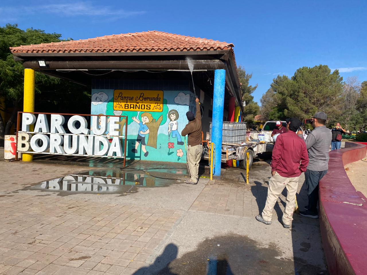 Como parte de las actividades que lleva a cabo el Gobierno Municipal para mejorar la imagen del Parque Borunda, personal de las direcciones de Servicios Públicos y Regulación Comercial continúa trabajando en ese espacio.