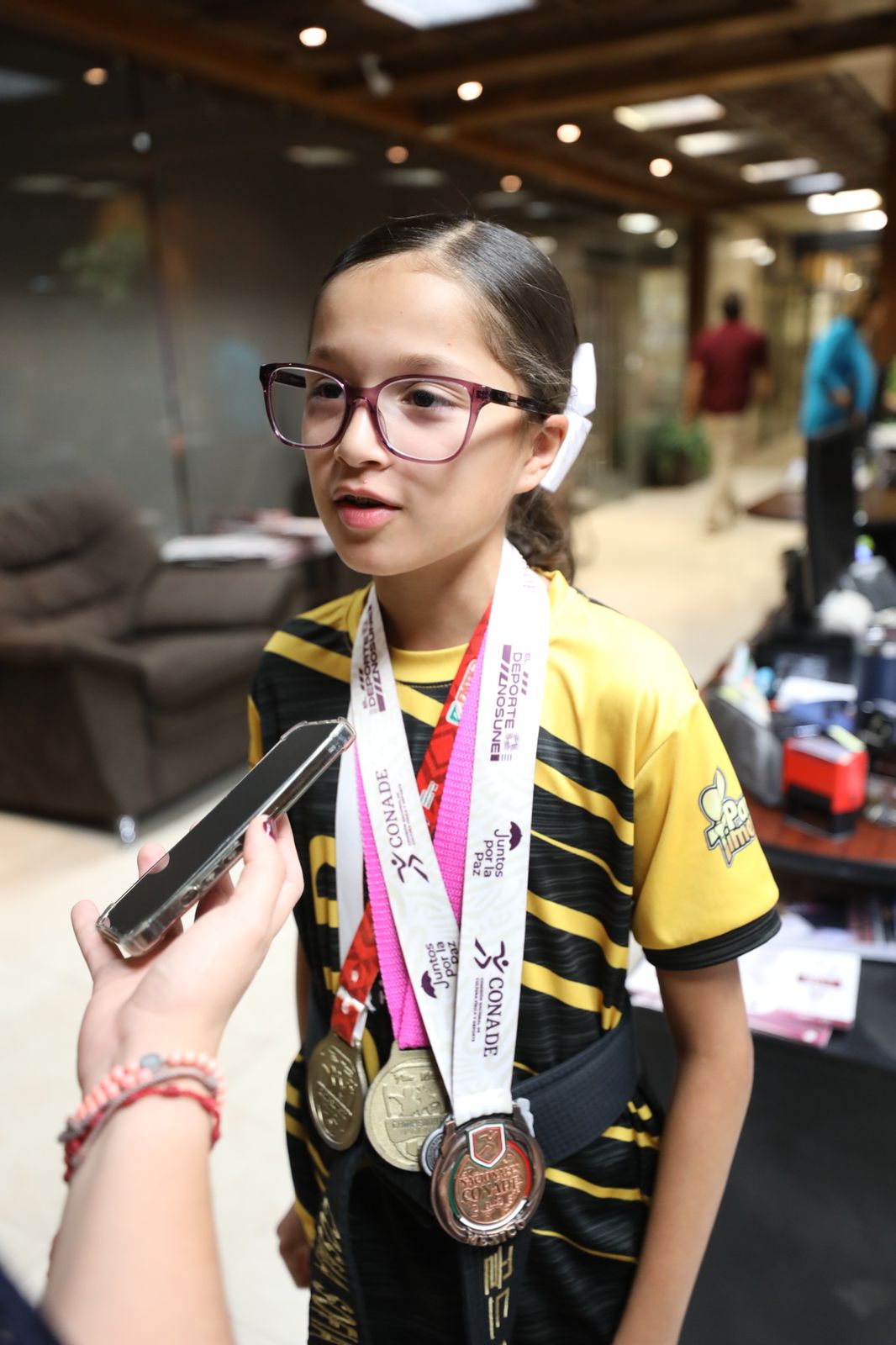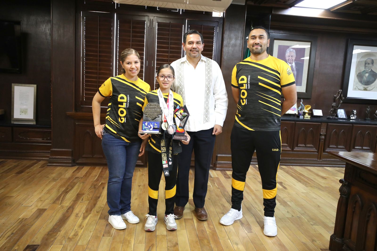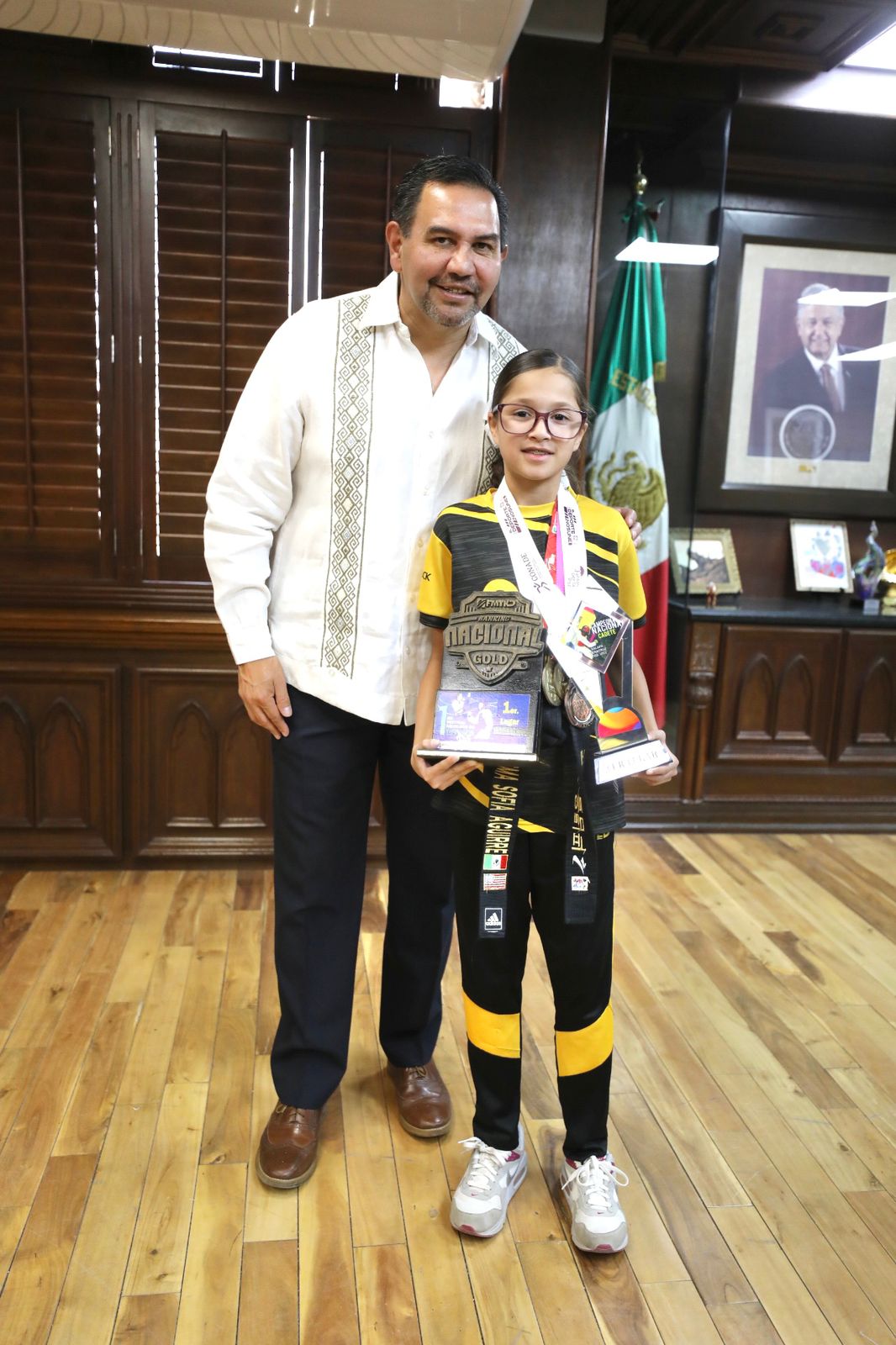 La tres veces campeona nacional en Taekwondo, Cosma Sofía Aguirre Chávez, visitó hoy al Presidente Municipal, Cruz Pérez Cuéllar, quien la felicitó por sus enormes logros en esta rama de las artes marciales a su corta edad, 12 años.