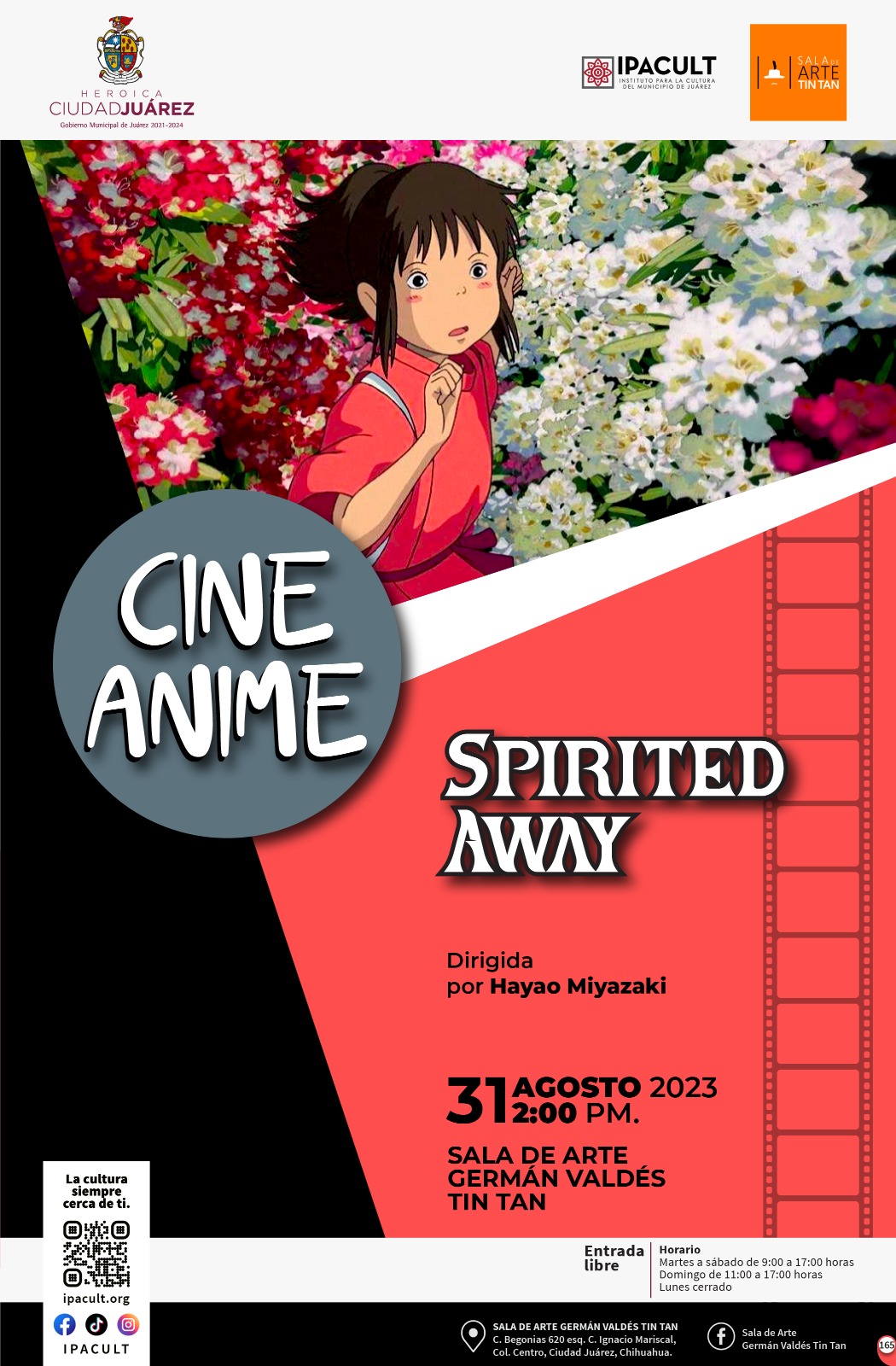 Es por ello que continúa el ciclo de cine Anime y ahora proyecta la cinta ??Spirited Away?, en la Sala de Arte Germán Valdés ??Tin Tan?, con dirección en la calle Begonias número 620, en la Zona Centro.