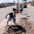 Personas migrantes realizan trabajos de limpieza en camellón de la avenida De los Aztecas