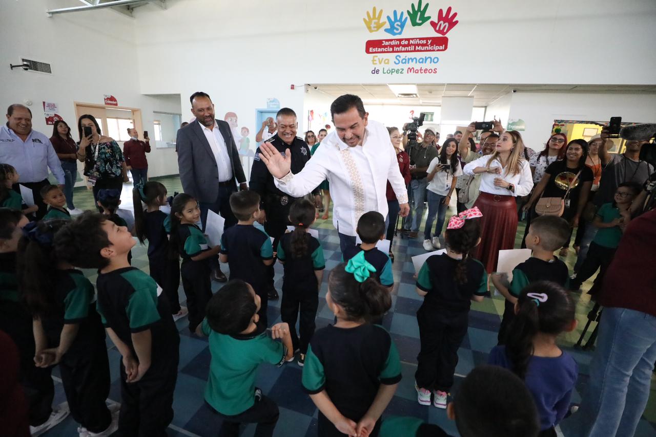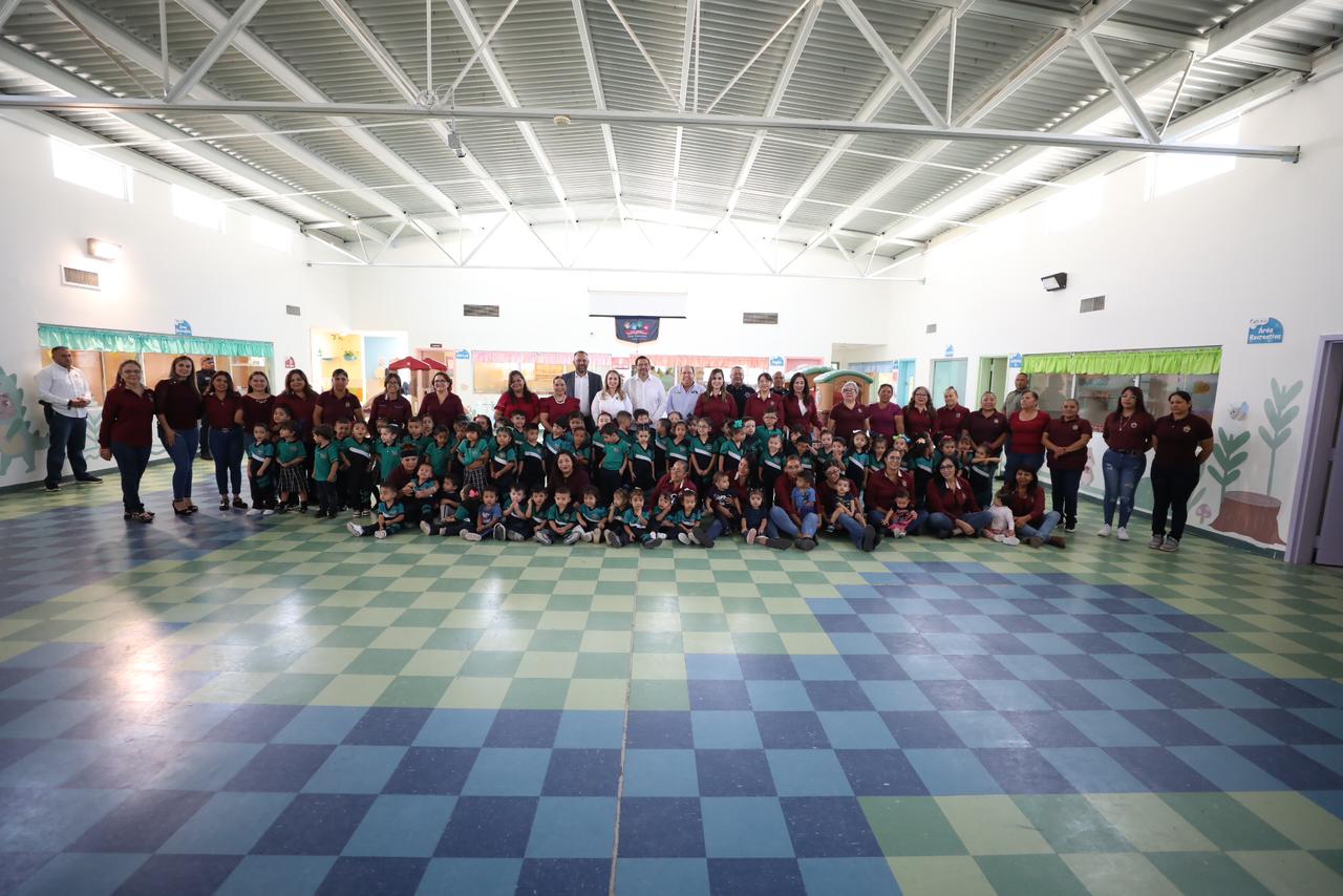 Con la remodelación de la fachada principal, mejoramiento de aulas, áreas recreativas con juegos didácticos y otras adecuaciones, el Gobierno Municipal mejoró las instalaciones del Jardín de Niños y Estancia Infantil Eva Sámano de López Mateos.