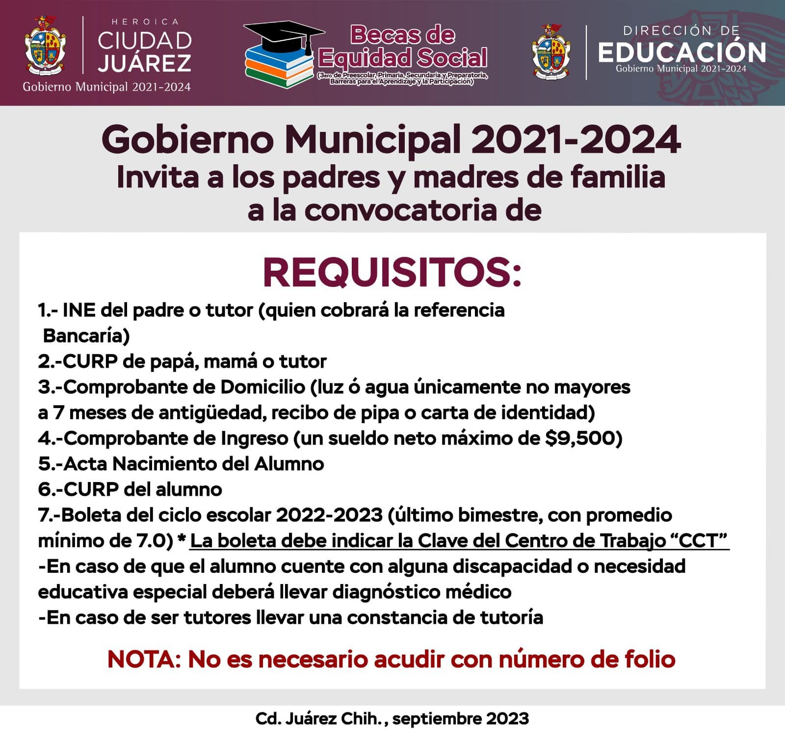 Los requisitos son la credencial de elector y la Clave �nica de Registro de Población (CURP) de los padres o tutores y otra del alumno.