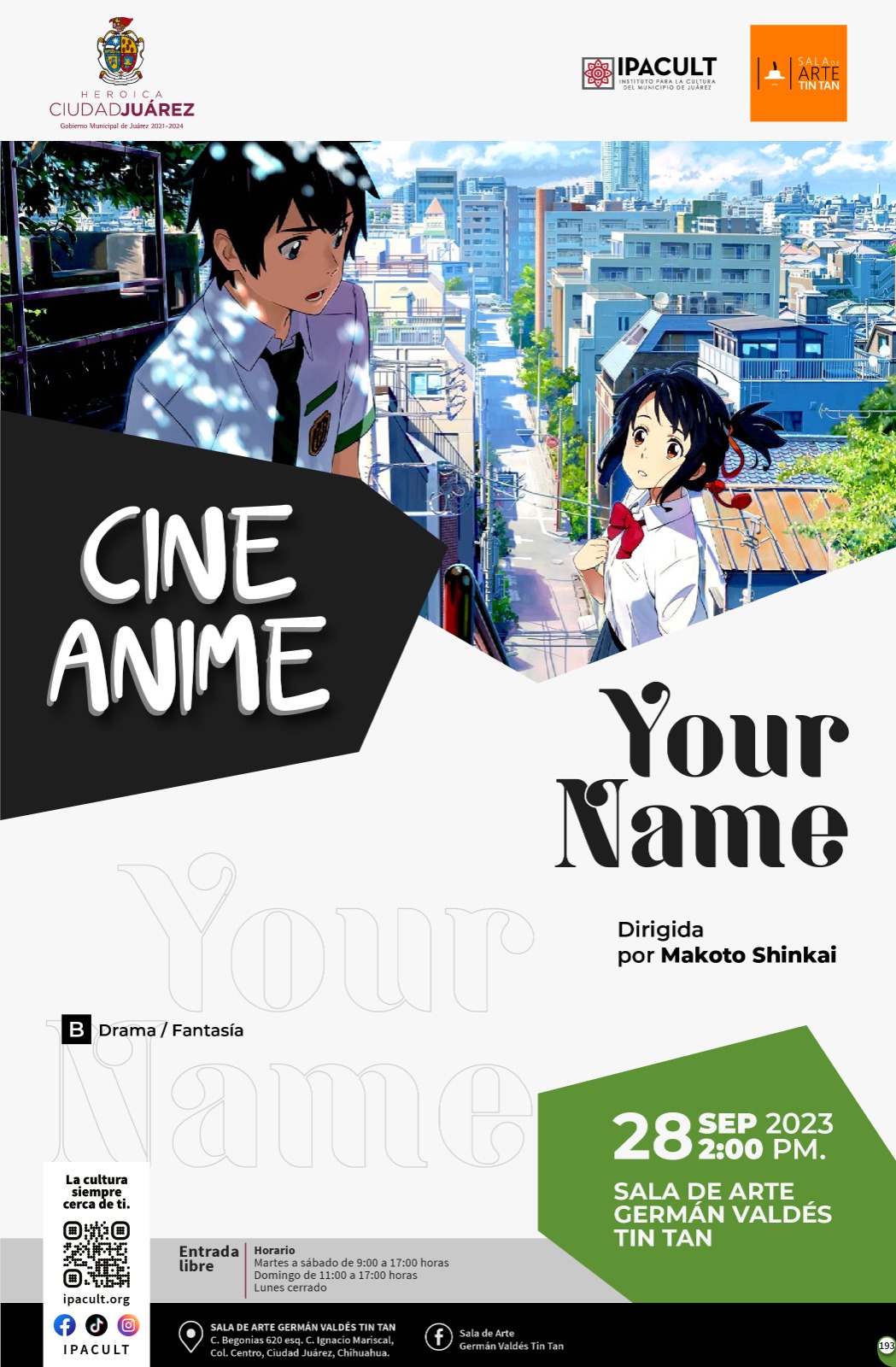Este próximo jueves 28 de septiembre, a las 2:00 de la tarde, en la Sala de Arte Germán Valdés, se presentará ??Your Name?, filme dirigido por el nipón Makoto Shinkai en el año 2016, en el cual mezcla el romance con la ciencia ficción y explora temas como la conexión humana, el destino y el tiempo, dio a conocer Liliana Fimbres, coordinadora del espacio cultural.