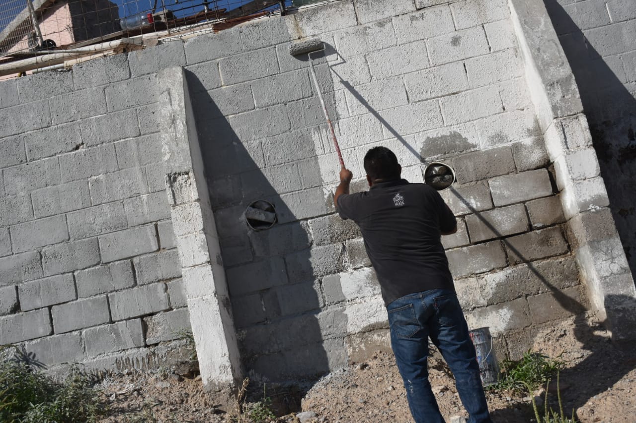 Personal de la Dirección de Limpia trabaja en pintar la barda del panteón de la Chaveña que tiene grafiti, como parte del mantenimiento que se le está dando al recinto ante la próxima celebración del Día de Muertos, dio a conocer Gibran Solís Kanahan, titular de la dependencia.