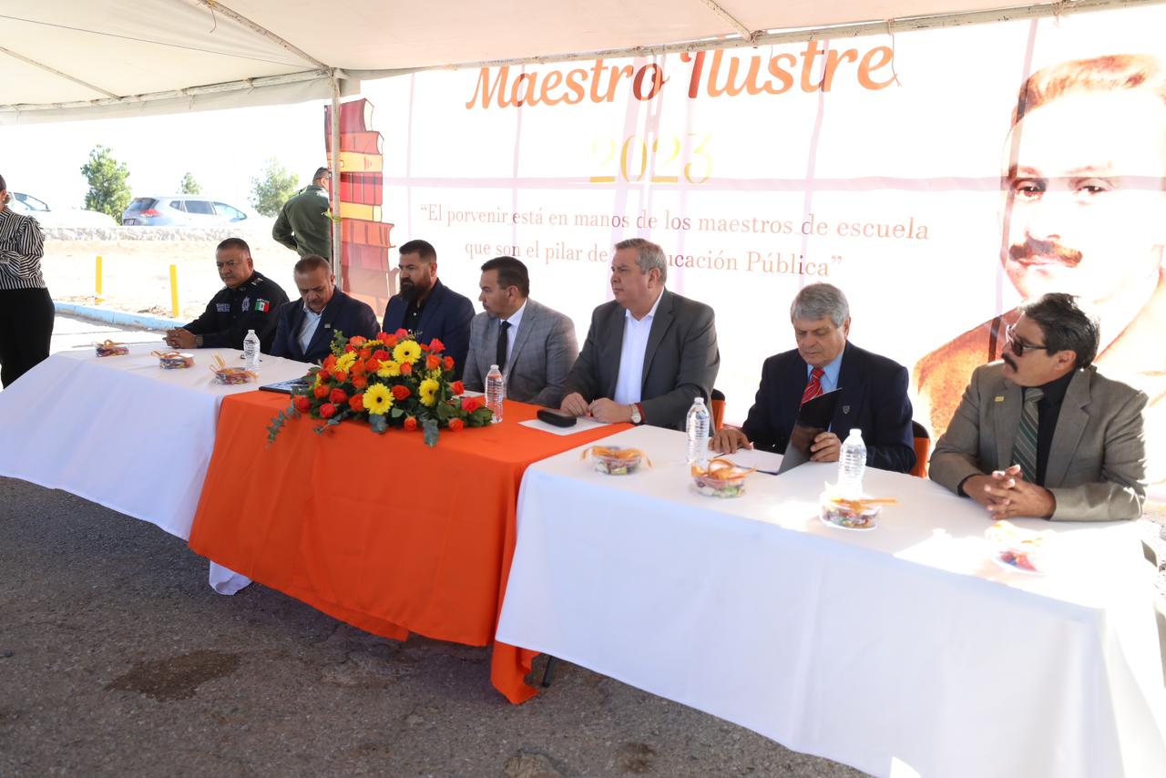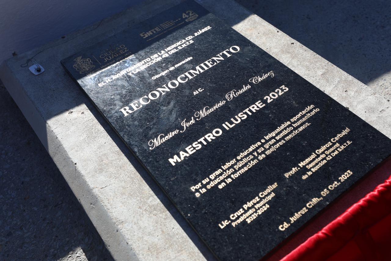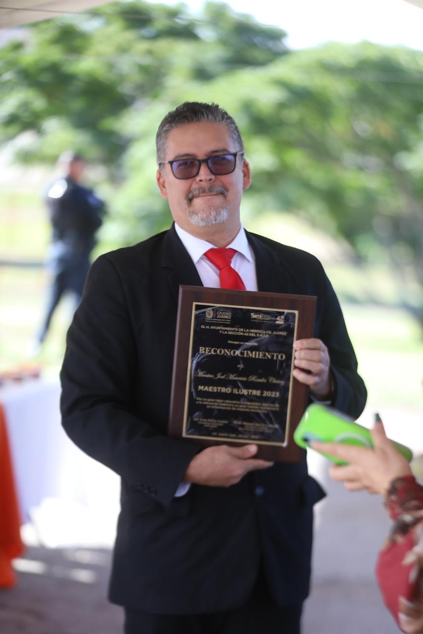 En el marco de la ceremonia efectuada en la Rotonda del Maestro Ilustre, el alcalde reconoció la labor realizada a lo largo de la carrera del maestro Joel Mauricio Rosales, quien se desempeñó como profesor de Educación Física en escuelas públicas y aún continua con la docencia en la Universidad Autónoma de Ciudad Juárez.