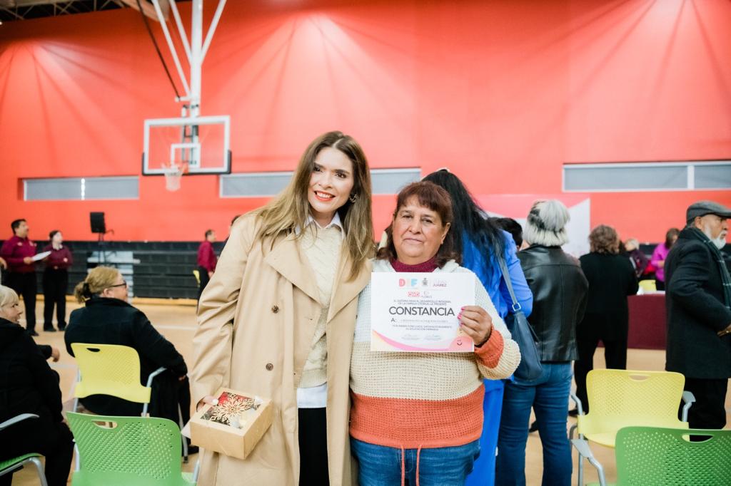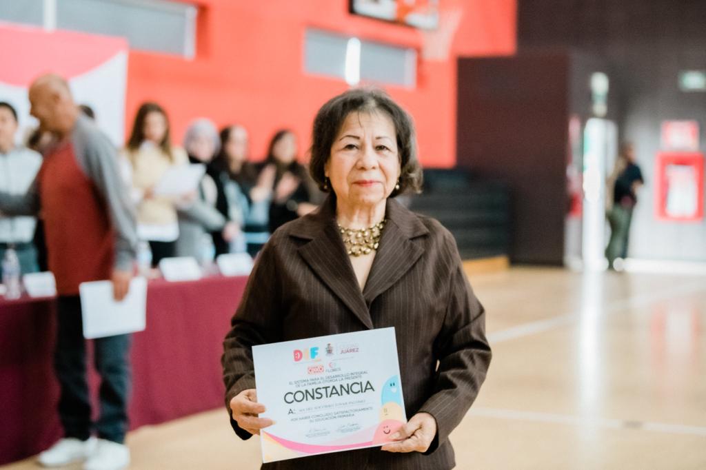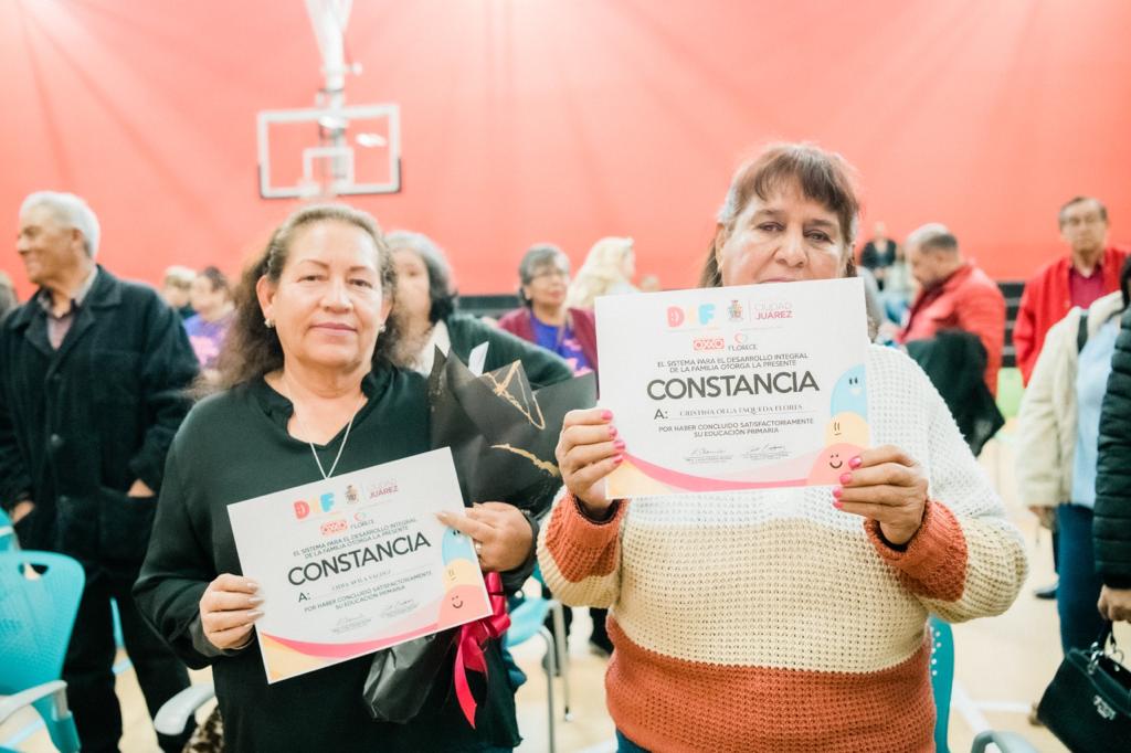 Con alegría, 75 personas de la tercera edad recibieron un reconocimiento por parte del Sistema para el Desarrollo Integral de la Familia del Municipio de Juárez (DIF), por haber concluido la educación primaria o secundaria, así como diferentes talleres con el apoyo de la empresa Oxxo, del Instituto de Capacitación para el Trabajo del Estado de Chihuahua (ICATECH) y del Instituto Chihuahuense de Educación para los Adultos (ICHEA).