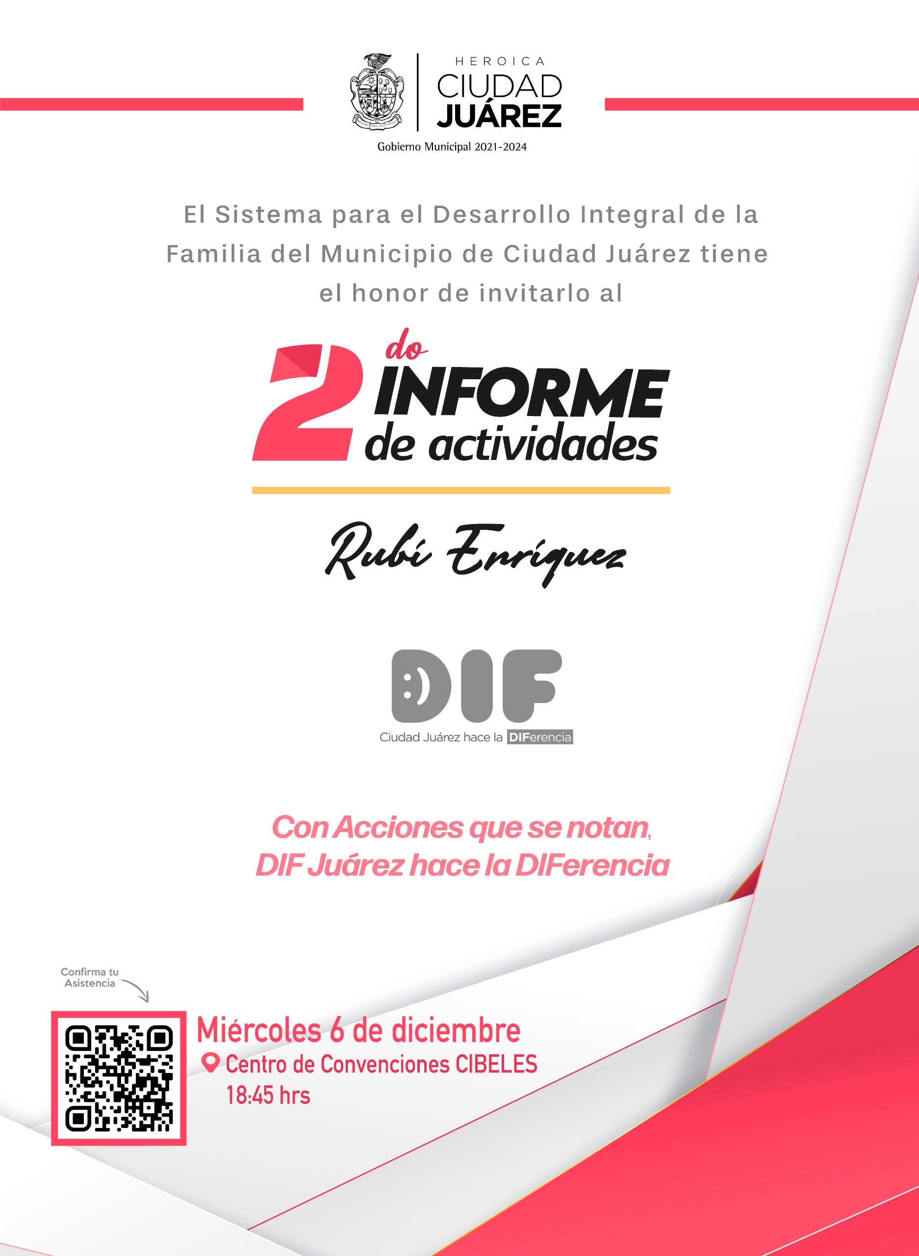 Ante la presencia de la comunidad juarense, Rubí Enríquez, presidenta del Sistema para el Desarrollo Integral de la Familia del Municipio (DIF), presentará su Segundo Informe de actividades este próximo 6 de diciembre.