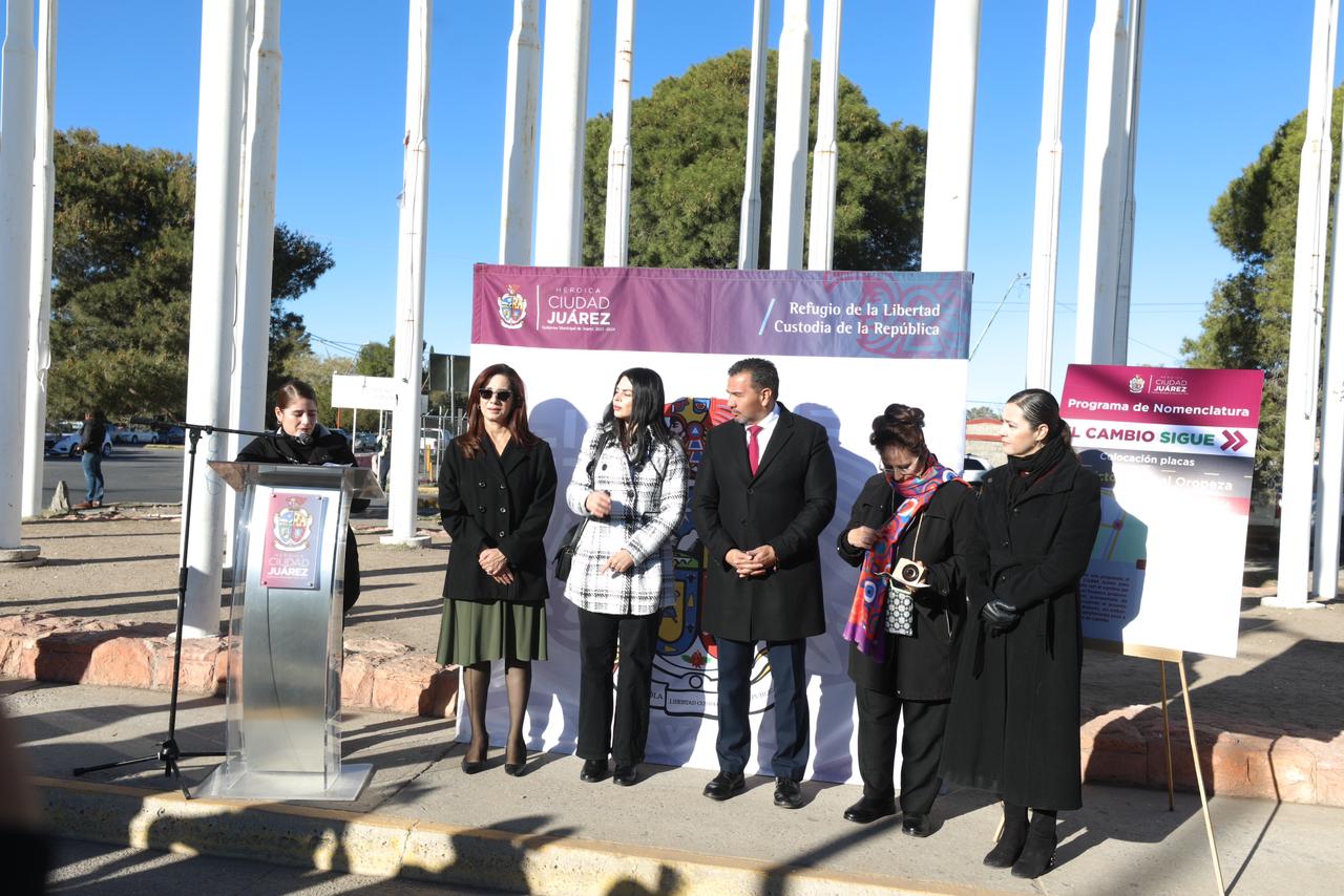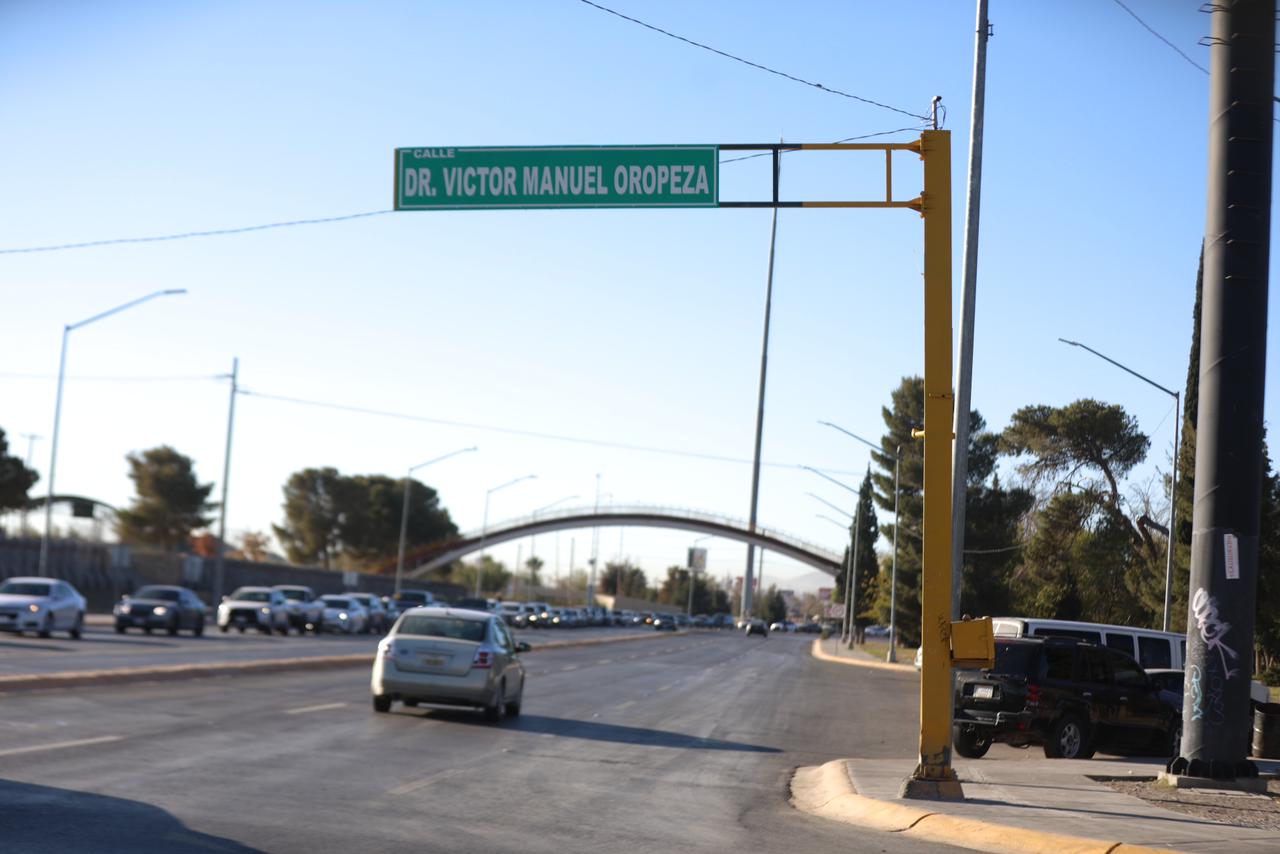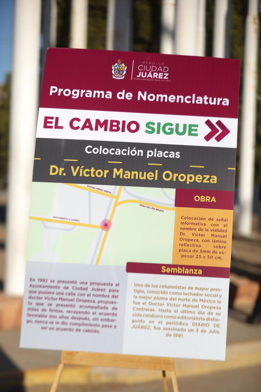 Este día el Presidente Municipal, Cruz Pérez Cuéllar, estuvo en la zona de El Chamizal para avalar la colocación de placas de nomenclatura en honor al Dr. Víctor Manuel Oropeza Contreras, para dar cumplimiento a un acuerdo de Cabildo que data del año 1994.