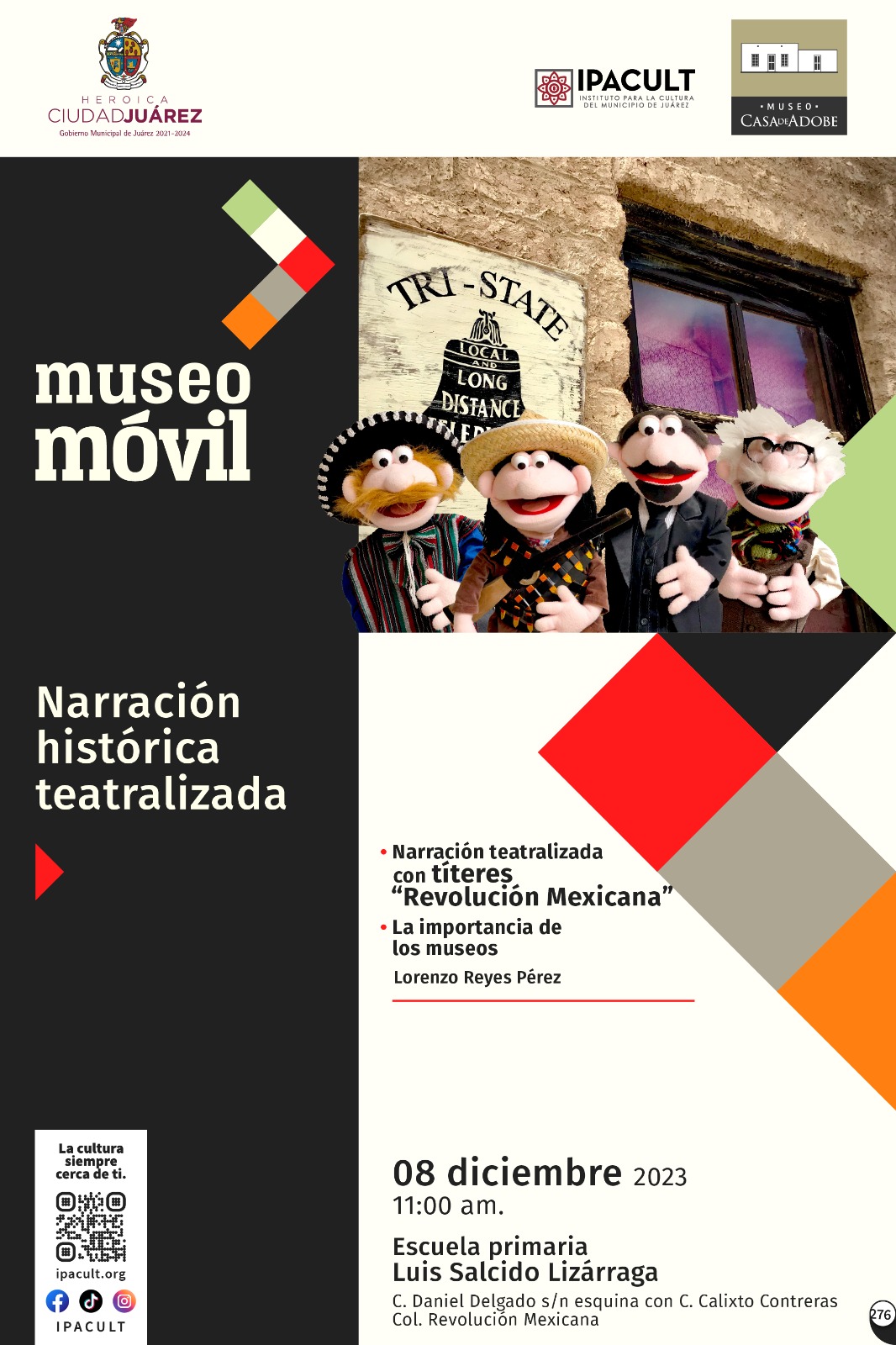 La primera parte las y los niños, escucharán una narración teatralizada por medio de unos simpáticos títeres representando muy a su estilo, a Francisco I. Madero y Adela Velarde Pérez, personajes que les contarán la relevancia de la toma de ciudad Juárez para la caída del régimen Porfirista en el año de 1911.