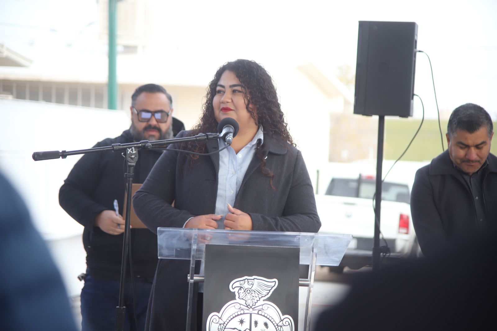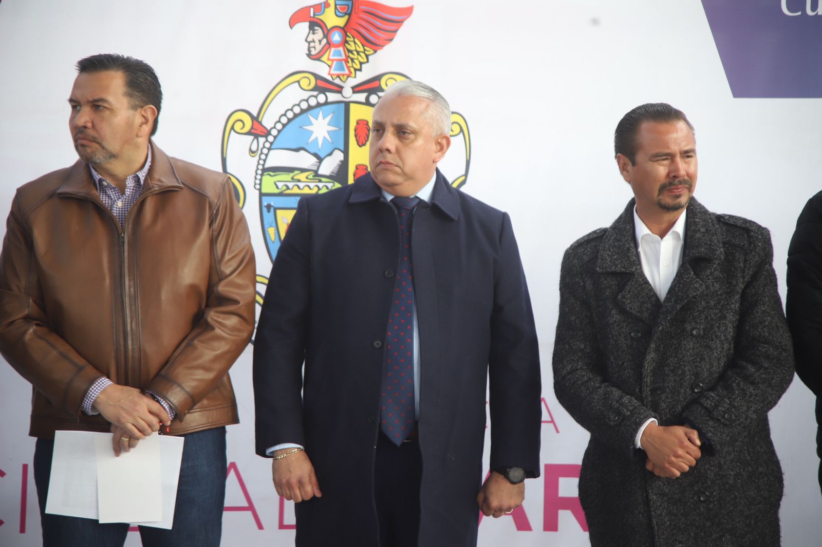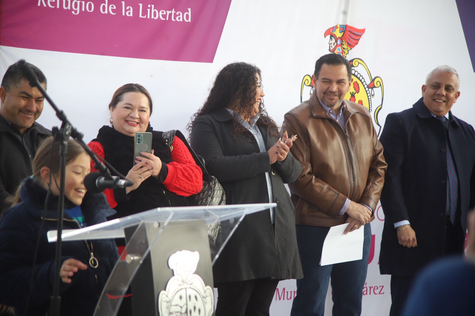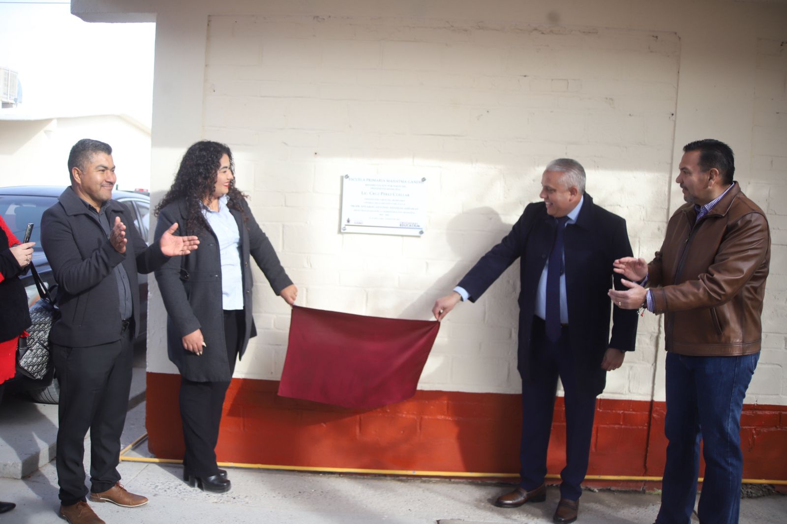 Durante la entrega de obras estuvieron Ismael Rueda, coordinador de Infraestructura Educativa del Municipio; el regidor Jorge Marcial Bueno Quiroz y Eduardo Zendejas, secretario general de la Sección Octava del SNTE.