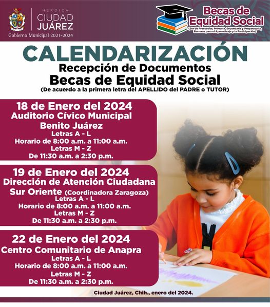 El lunes 22 de enero la dependencia se trasladará hasta el poniente de la ciudad, por lo que la sede para el trámite de las becas será el Centro Comunitario de Anapra, en los horarios y apellidos de acuerdo a los puntos anteriores.