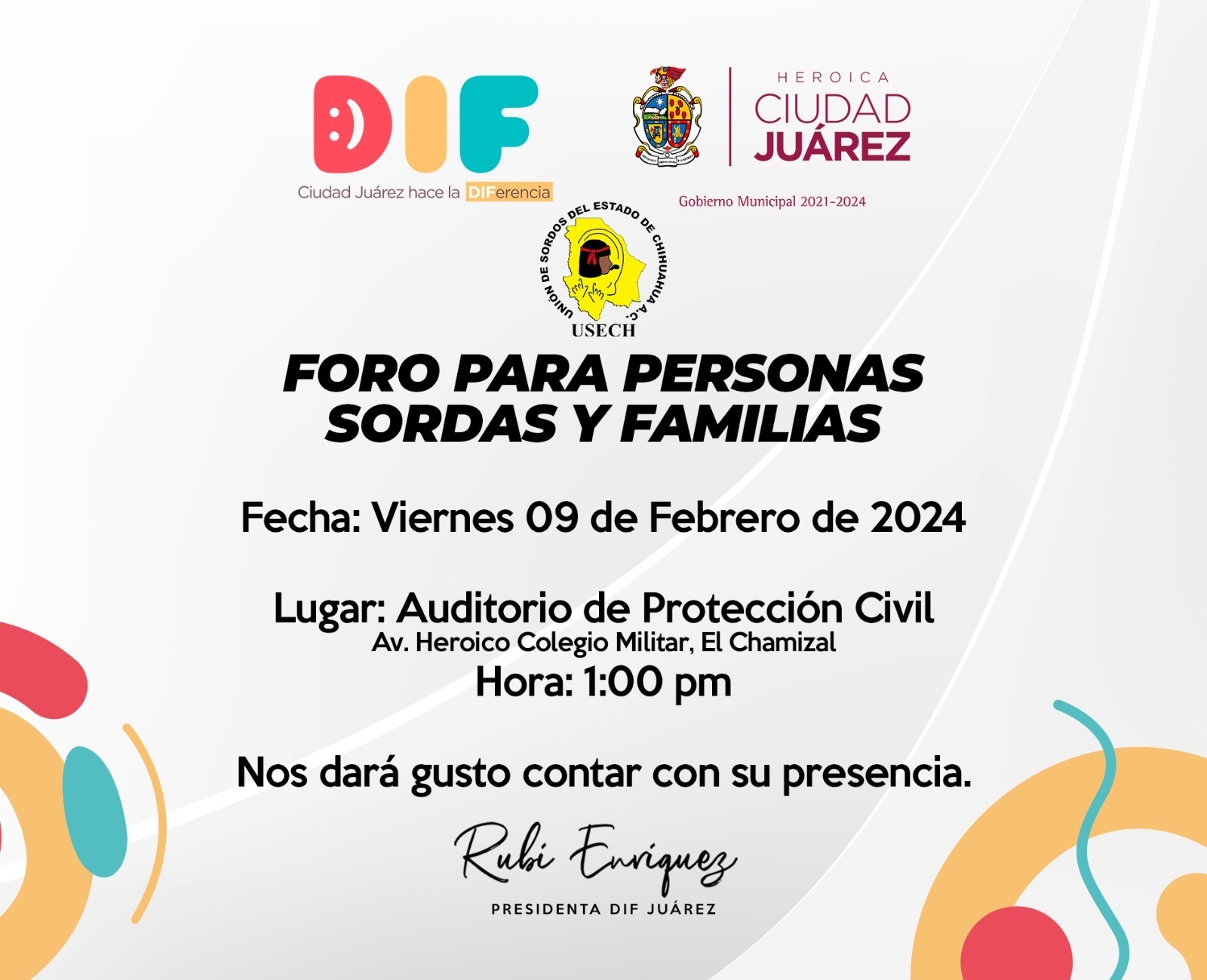 El Gobierno Municipal, a través del Sistema para el Desarrollo Integral de la Familia del Municipio (DIF) en coordinación con la Unión de Sordos del Estado de Chihuahua (USECH), invita al Foro para Personas Sordas y Familias.