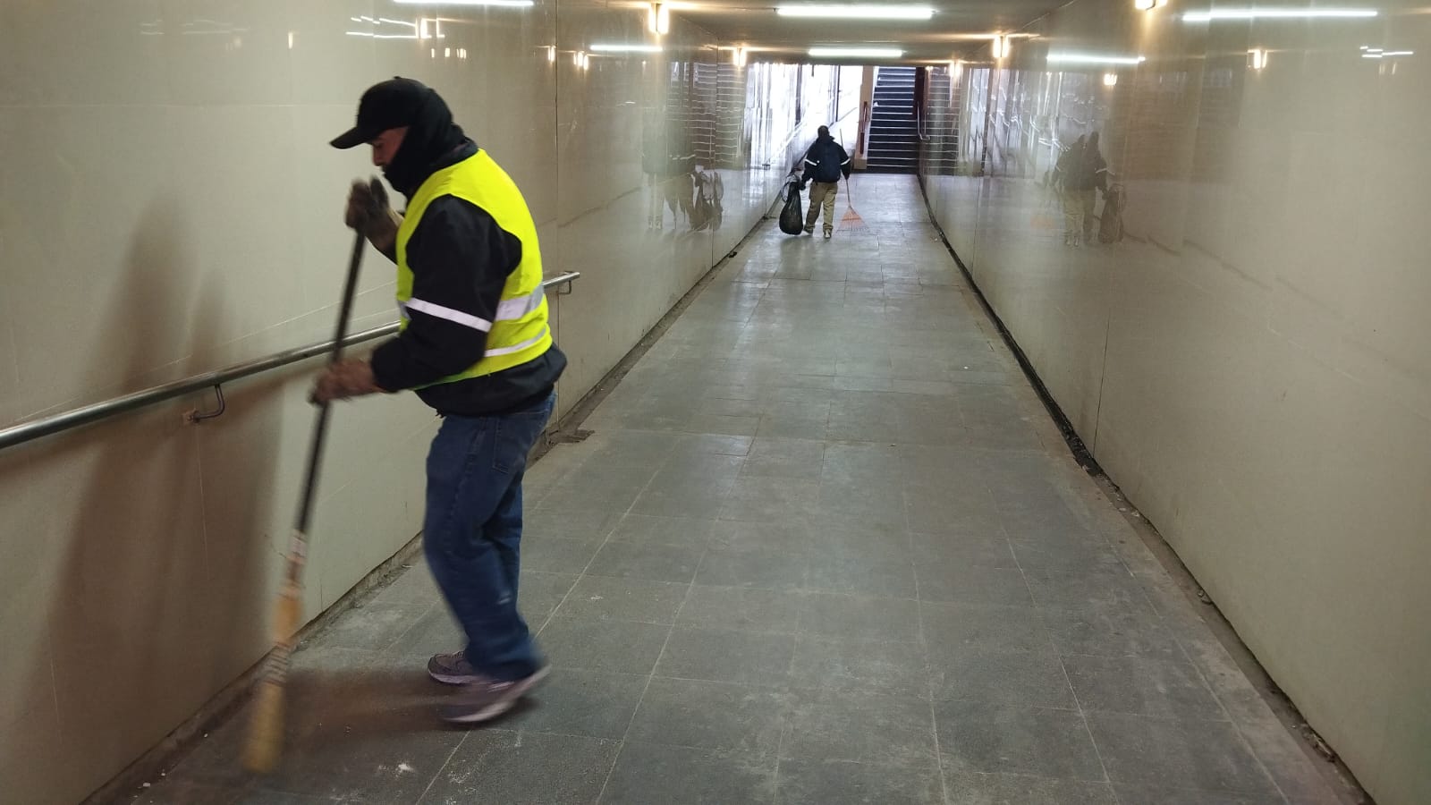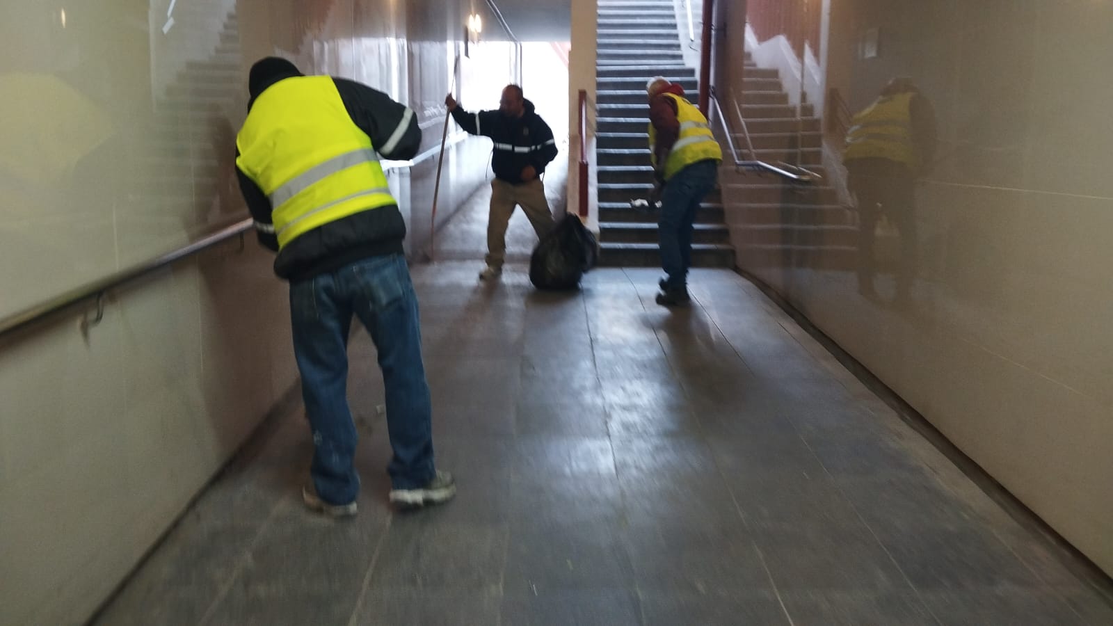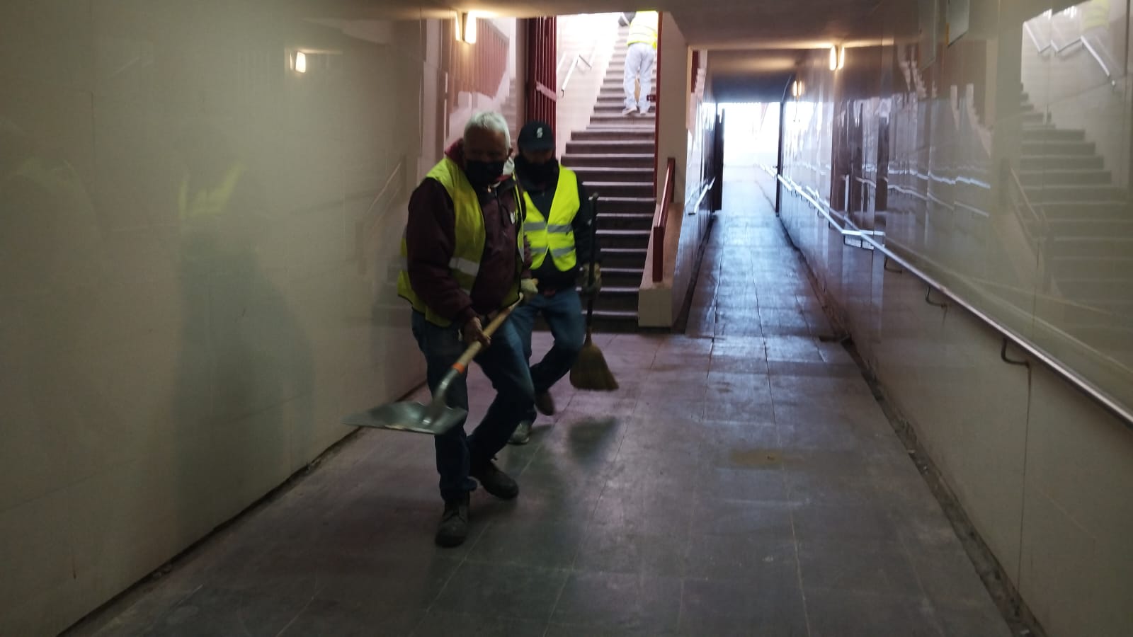 Personal de la Dirección de Limpia trabaja en la limpieza del área peatonal del túnel que se encuentra en el cruce de la avenida 16 de Septiembre y Francisco Villa, en la Zona Centro, informó Gibran Solís Kanahan, titular de la dependencia.